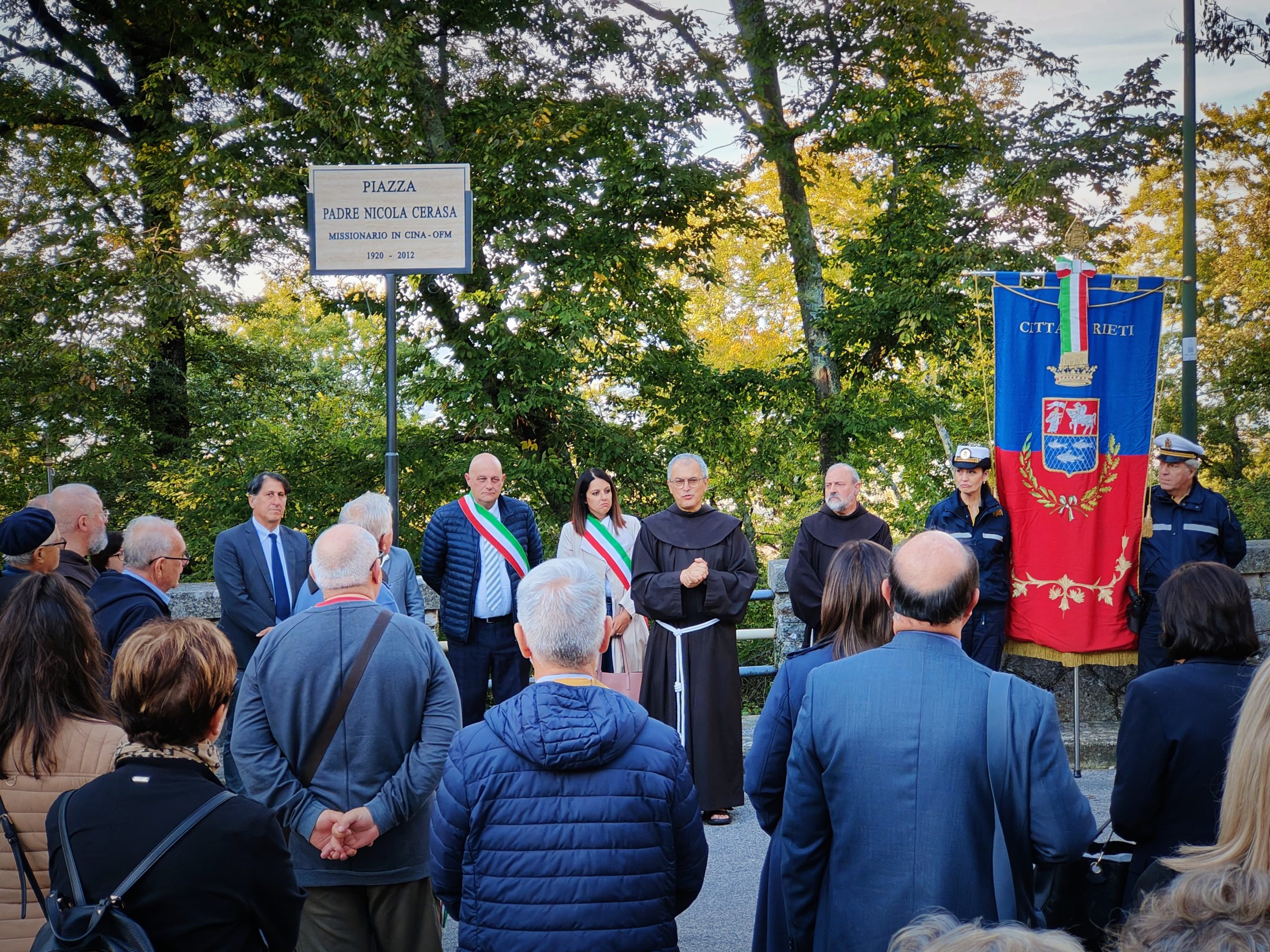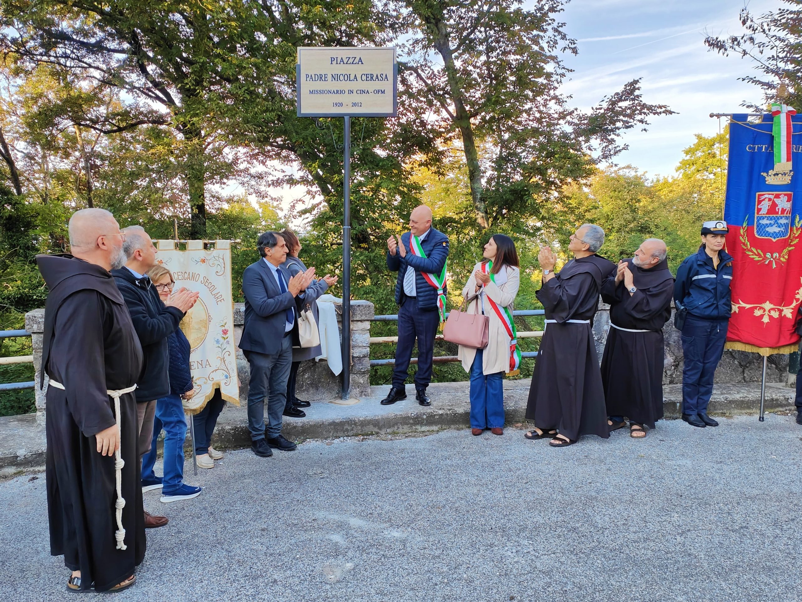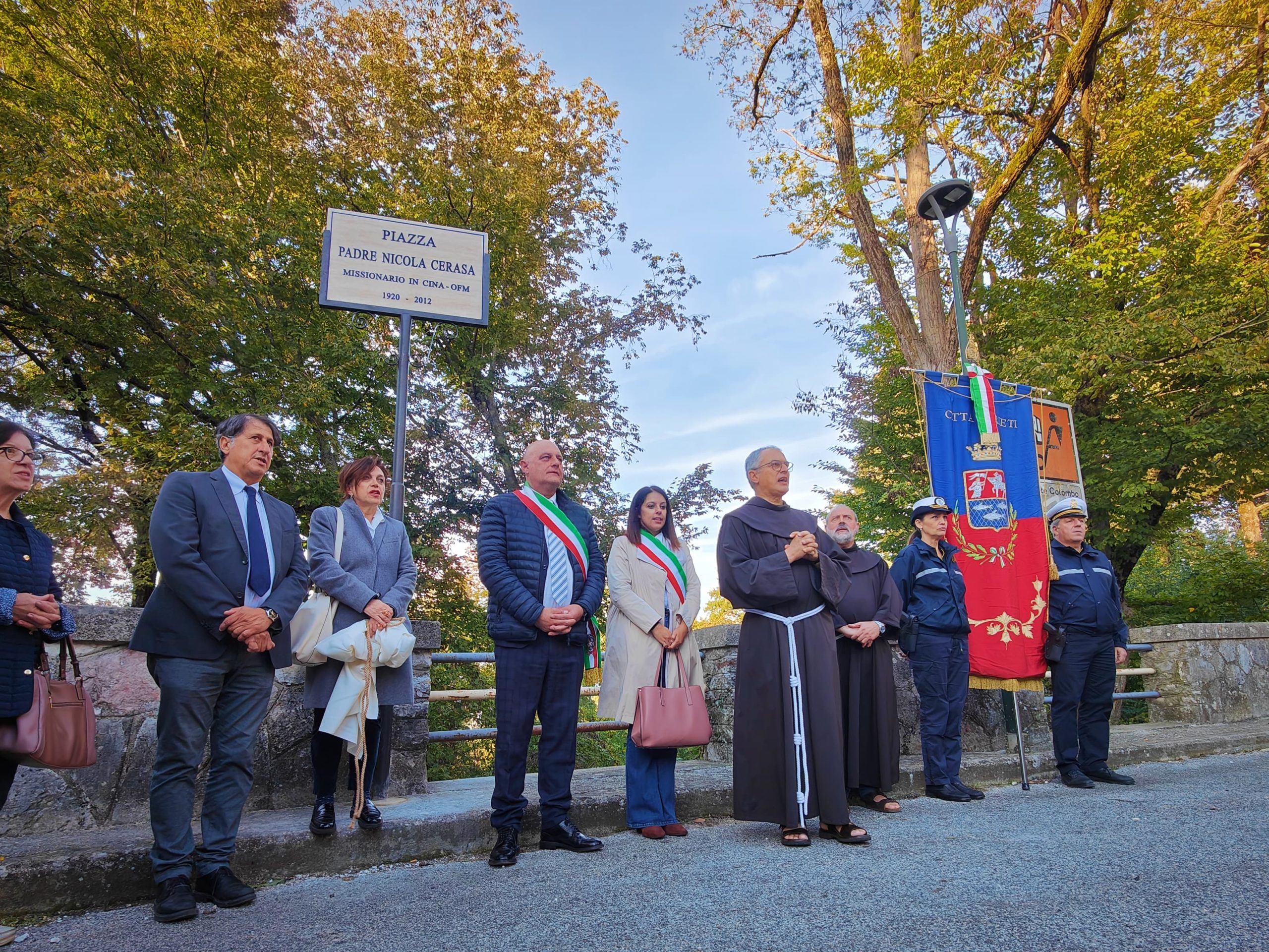 Un video, preparato da padre Francesco Di Pede, ha rievocato la biografia e la grandezza spirituale di questo frate, la cui memoria è viva tra i parenti e i compaesani, come ha testimoniato Tonino Cicconetti, uno dei nipoti, intervenuto a nome dei familiari di Cerasa, presenti in gran numero alla cerimonia. Si deve a loro se l’amministrazione ha raccolto la proposta di intitolargli uno spazio nel territorio comunale, come ha spiegato il presidente del consiglio comunale, Claudio Valentini, che ha seguito l’iter burocratico assieme all’assessore alla Cultura Letizia Rosati. Anche quest’ultima, presente insieme ad altri assessori e consiglieri comunali, ha sottolineato l’importanza di onorare un religioso che ha reso grande la presenza francescana in terra cinese, unico ordine cattolico a essere oggi presente nell’ex Celeste Impero in forma pienamente legittima e non clandestina, e questo anche grazie a padre Cerasa, ha spiegato il generale Fusarelli, che con grande saggezza e lungimiranza seppe al tempo gettare le basi, anticipando i tempi nella Chiesa di allora, di un dialogo paziente con la cultura locale.