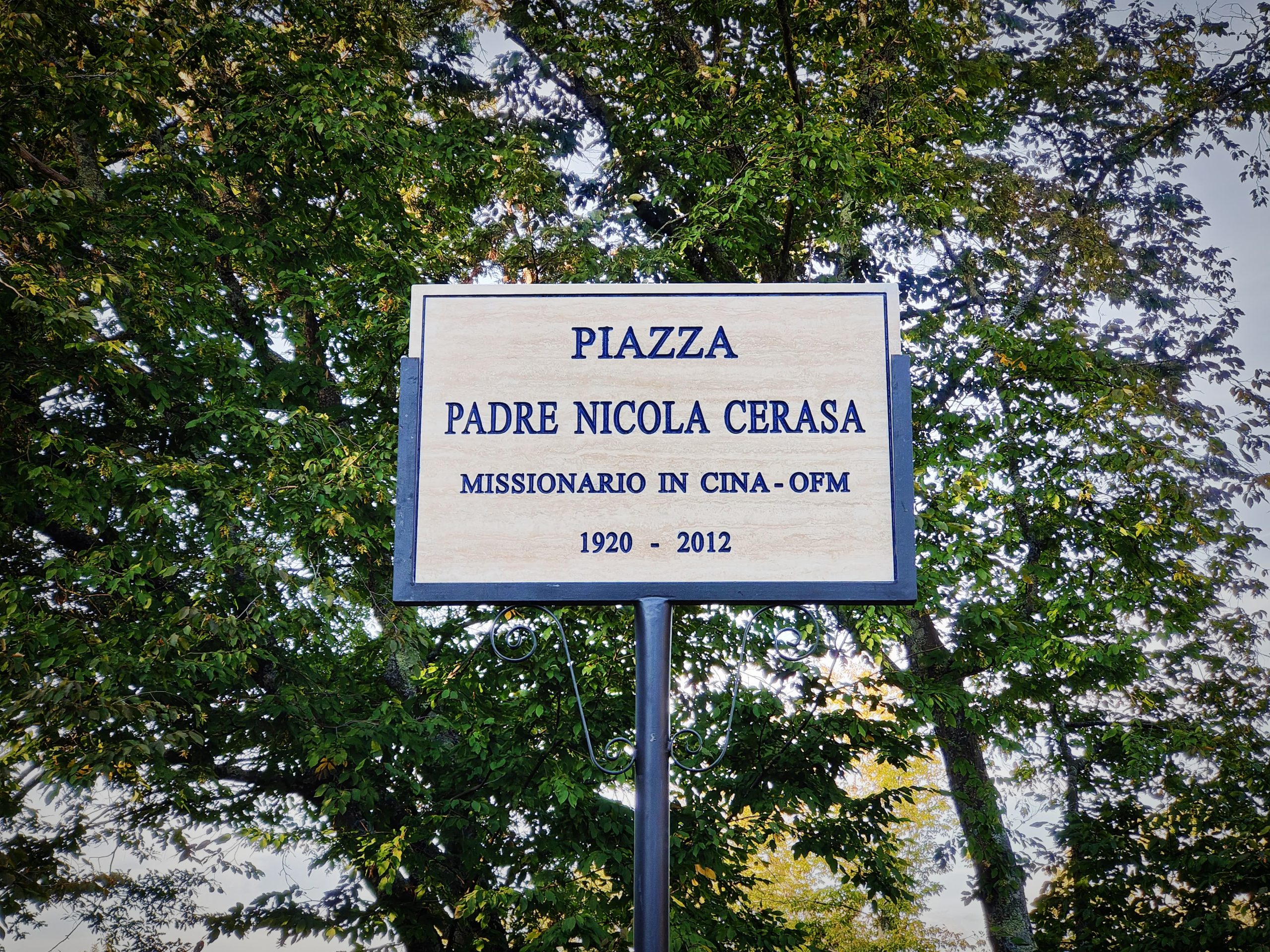 Nella targa apposta sul piazzale sotto il santuario di Fonte Colombo si legge: «Piazza Padre Nicola Cerasa, Missionario in Cina – OFM, 1920-2012». Targa scoperta sabato pomeriggio nella cerimonia con cui Rieti ha inteso onorare un figlio della propria terra distintosi nel carisma francescano.
