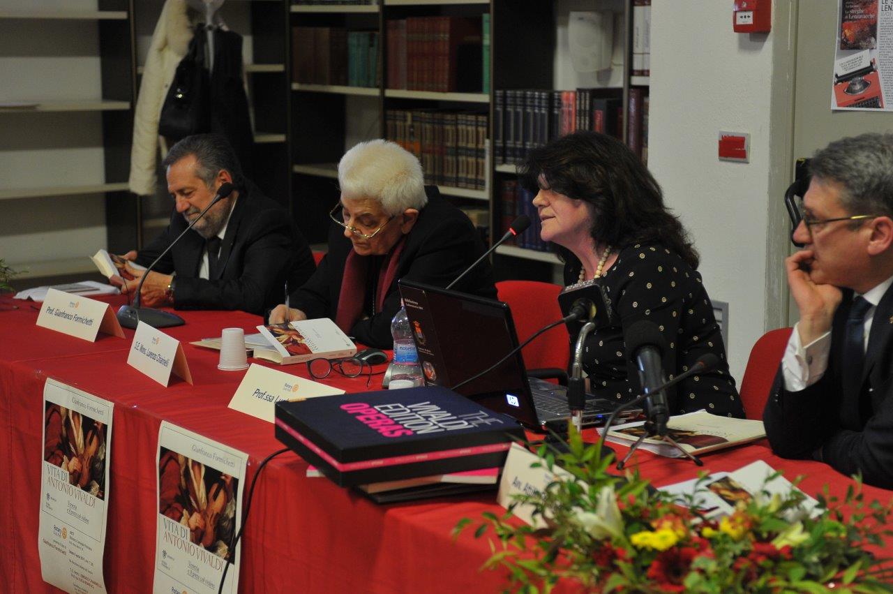 Sala della biblioteca comunale gremita per la presentazione del libro Venezia e il prete col violino. Vita di Antonio Vivaldi di Gianfranco Formichetti. Un ritratto, come annuncia il titolo, non solo sul prete rosso, ma anche della quotidianità della vita lagunare, da intrecciare agli incontri con i potenti del tempo: da papa Benedetto XIII a Ferdinando di Baviera, da Federico Cristiano di Sassonia a Carlo VI.