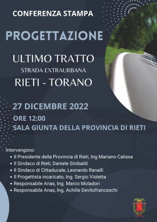 Si terrà il 27 dicembre alle ore 12 nella sala consiliare della Provincia di Rieti una conferenza stampa per avviare la progettazione dell’ultimo tratto della Strada Extraurbana Rieti-Torano, nello specifico quello che va da Grotti a Rieti.