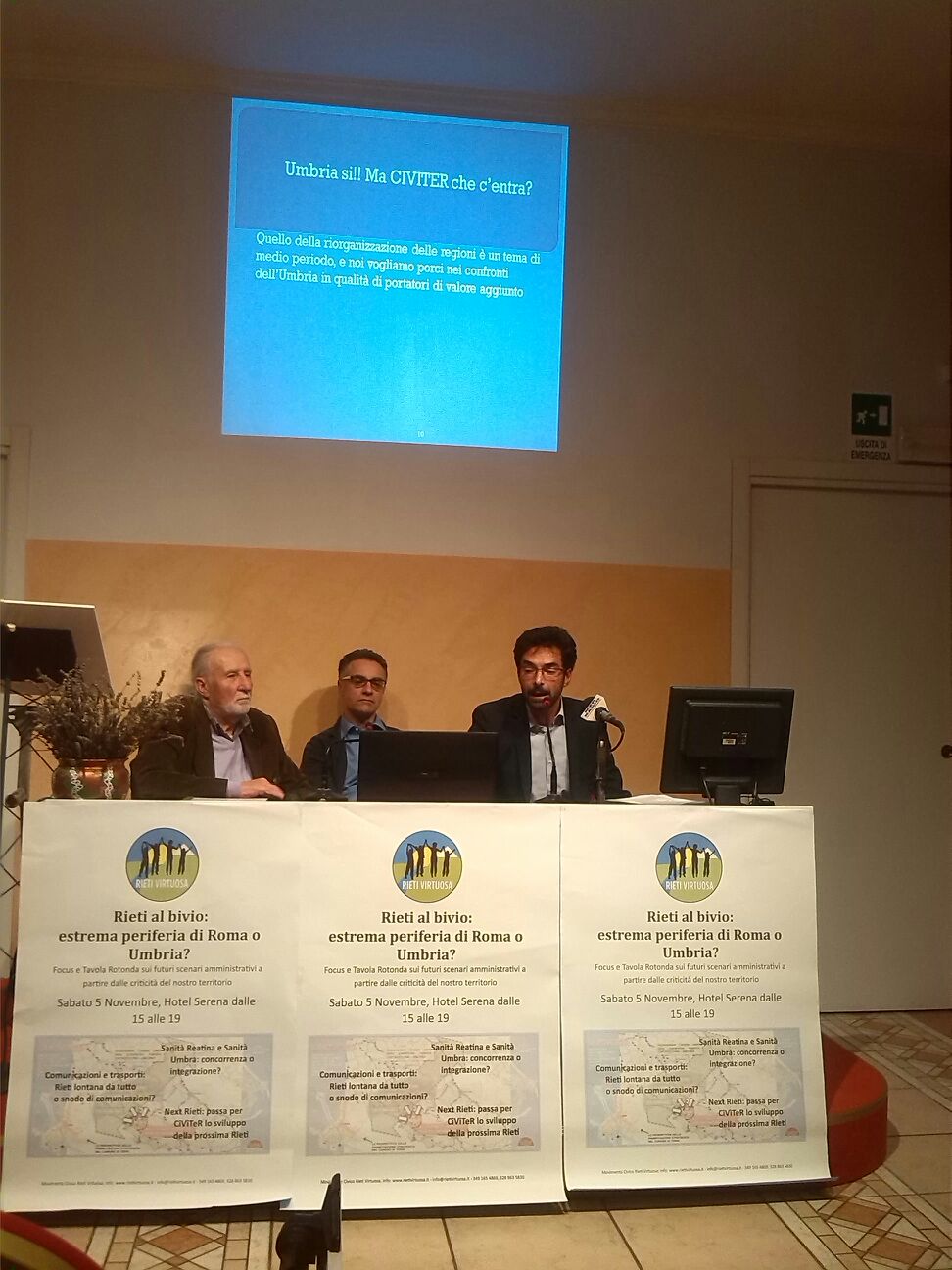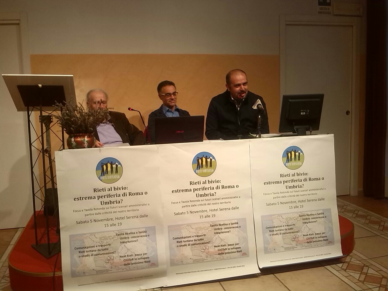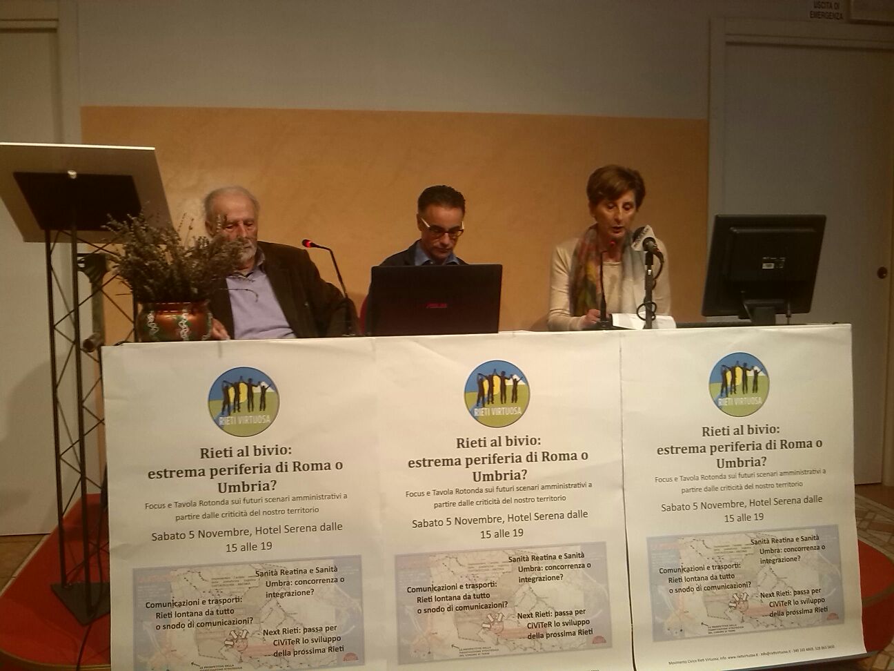 Dopo una introduzione al contesto attuale ed una sulle ragioni storiche (da parte di Marco Giordani e dell’avvocato Gianfranco Paris), sono stati trattati i temi della sanità (da parte di Annapaola Pitotti, di Rieti Virtuosa), della mobilità (da parte di Giuseppe Gizzi e Gabriele Bariletti) e di linee di sviluppo strategico (da parte di Daniele Rinaldi).