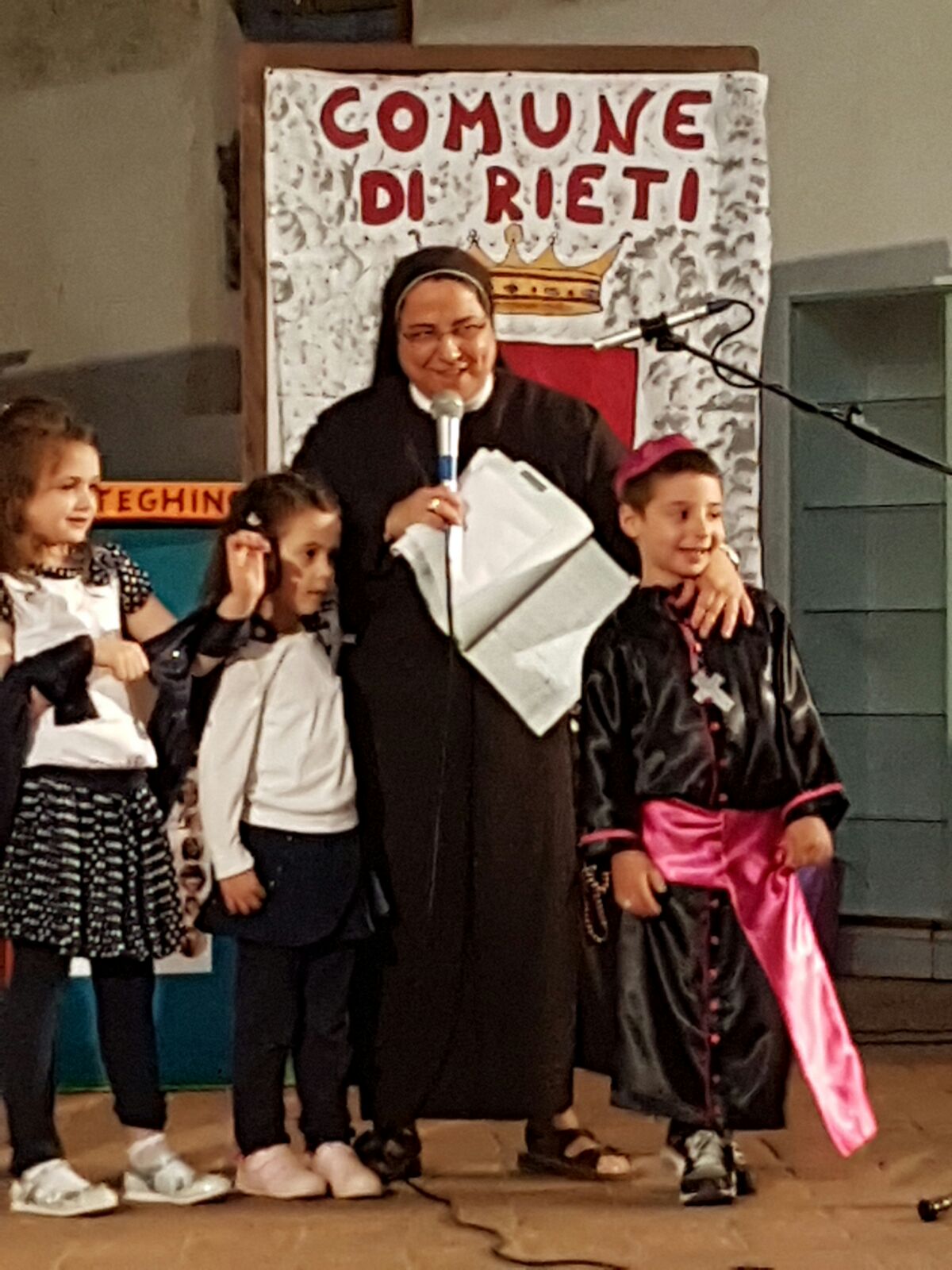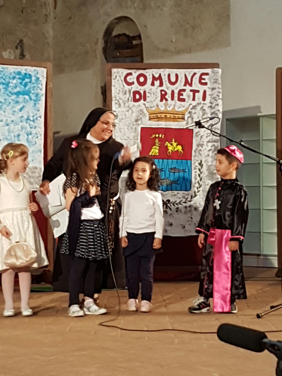 La scenografia rappresentava la città, la Cattedrale, il teatro Vespasiano e l’asilo “Maraini”; sullo sfondo il monte Terminillo e lo stemma del Comune di Rieti. Il tutto si è svolto all’insegna della gioia vivificata dallo Spirito.