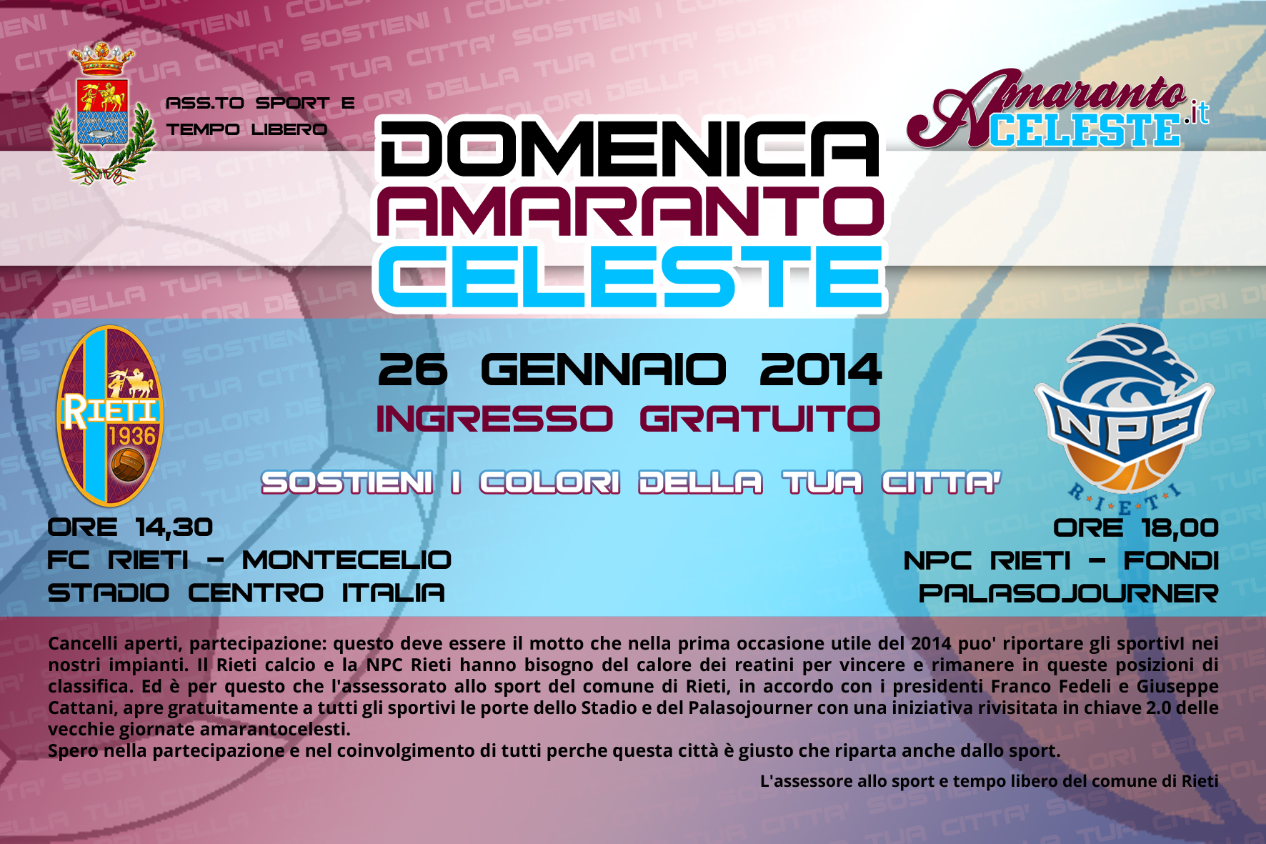 «Per la prima giornata Amarantoceleste del 2014 – dichiara l’Assessore allo Sport Alessandro Mezzetti – abbiamo scelto, con il fondamentale aiuto della Fc Rieti e della Npc, di aprire i cancelli dello Stadio Manlio Scopigno e del PalaSojourner per riavvicinare lo Sport alla Città. Il Rieti calcio e la Npc Rieti hanno bisogno del calore e del sostegno dei reatini per affrontare i rispettivi campionati e questa iniziativa serve anche a questo. Spero nella partecipazione e nel coinvolgimento di tutti, perché la nostra Città può rinascere anche grazie allo Sport».