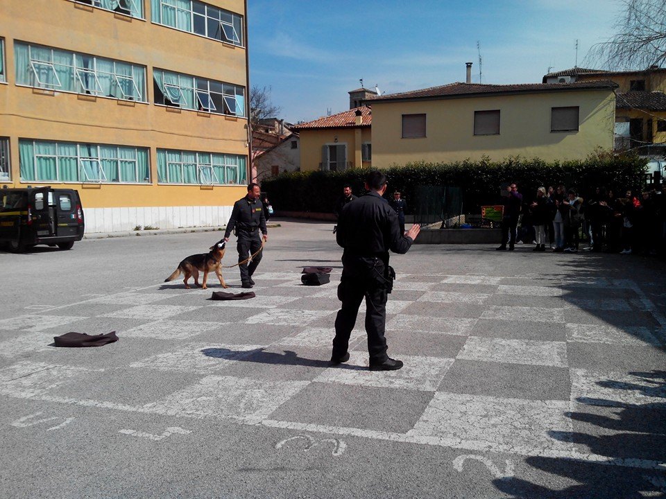 Sempre il tema della lotta alla droga, stavolta riguardo l’impegno delle forze di polizia nel contrastarne lo spaccio, l’attività che ha movimentato la mattinata degli alunni di terza media radunatisi in cortile a seguire le “performances” dei cani antidroga della Guardia di finanza. Istruiti circa l’attività dell’unità cinofila, appositamente giunta da Roma per queste dimostrazioni, e la lotta contro il traffico di stupefacenti in cui il corpo della GdF vanta una significativa esperienza, i ragazzi hanno potuto poi, attraverso simpatiche simulazioni, vedere in azione i bravi esemplari di pastore tedesco addestrati nel fiutare la droga nascosta in tasche e zaini: un momento divertente per rendersi consapevoli anche dell’impegno che le istituzioni mettono in atto contro gli spacciatori di sostanze che distruggono giovani (e non solo) menti e vite.