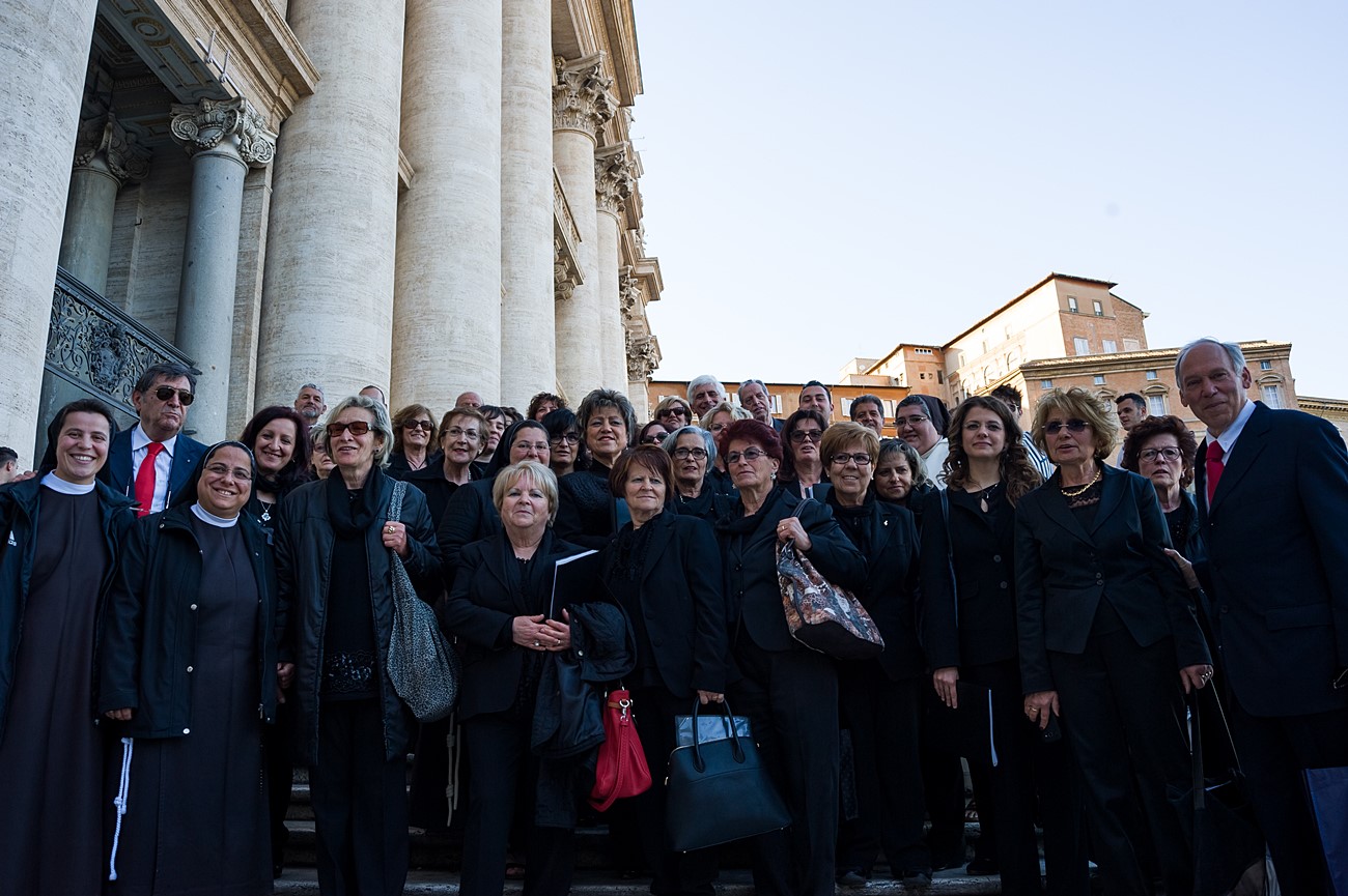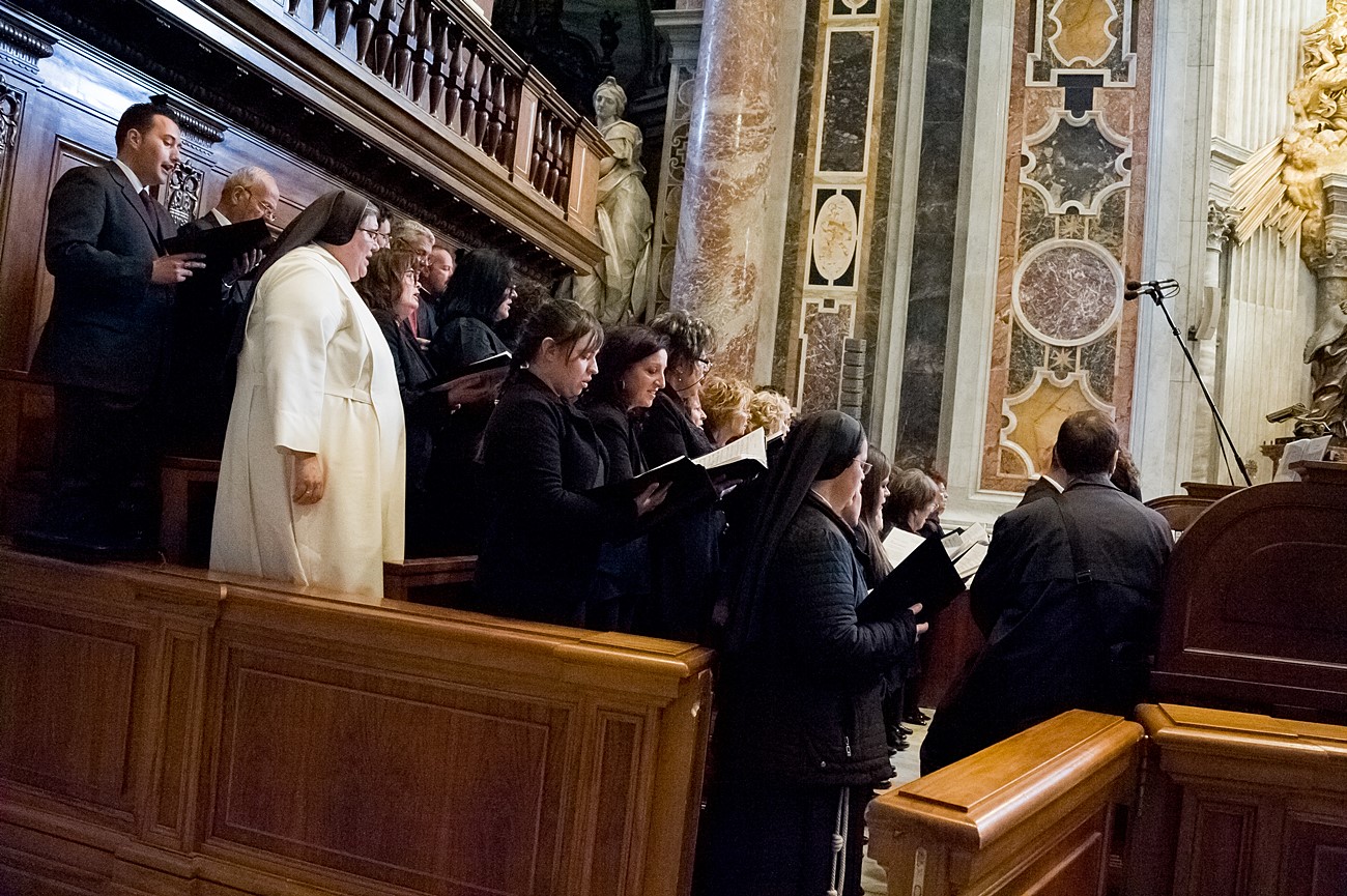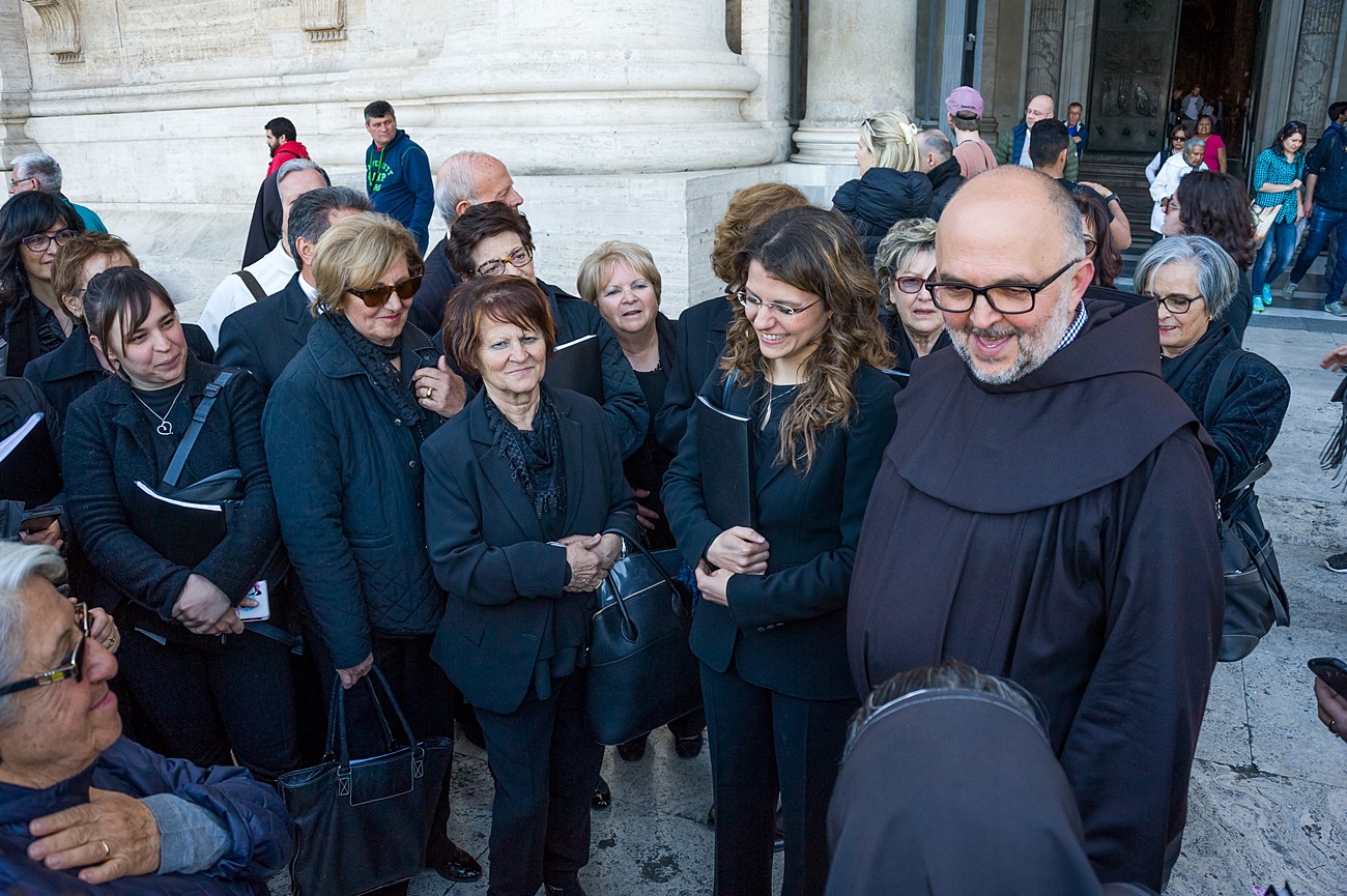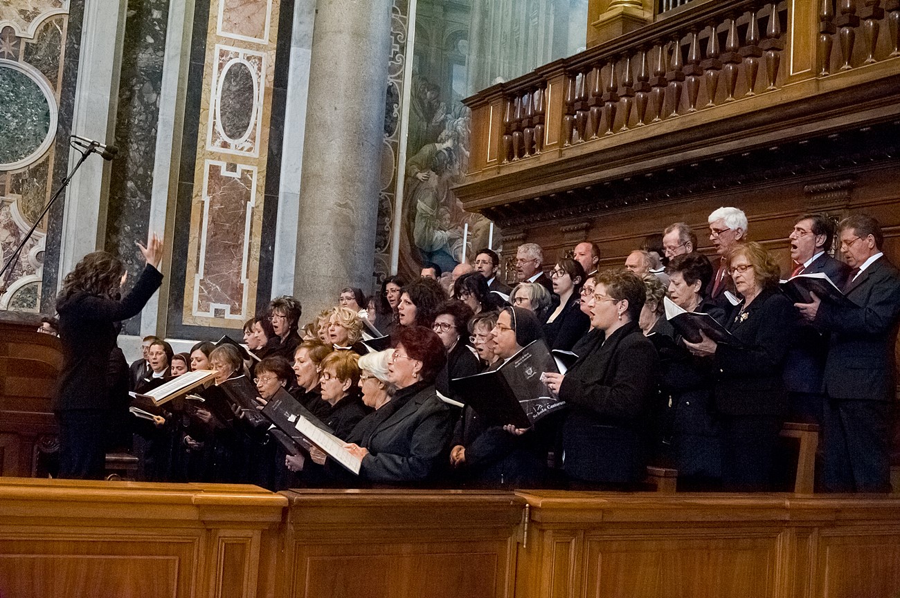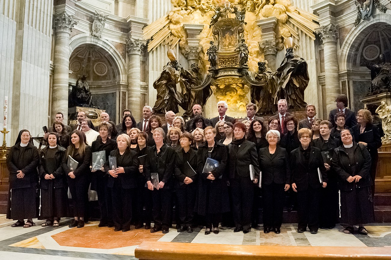 Prima di impartire la benedizione al termine della veglia, mons Pompili ha voluto espressamente ringraziare la schola per il generoso servizio prestato nei giorni faticosi eppure appaganti della Settimana Santa e soprattutto per l’aiuto che il repertorio scelto e l’atteggiamento dei coristi hanno recato alla preghiera di tutti. Per don Domenico, poco amante degli intermezzi extraliturgici all’interno delle celebrazioni, si è trattato di un gesto irrituale, che peraltro non è stato l’unico. Il grazie del vescovo non si è infatti fermato alle parole, ma si è tramutato in dono concreto: il 30 aprile, III domenica di Pasqua, grazie al suo interessamento i cantori sono stati gratificati anche con l’onore di poter animare una messa all’altare della Cattedra in San Pietro. A presiedere l’arciprete della Basilica Vaticana, il cardinale Angelo Comastri, che prima di congedare l’assemblea ha lodato il contributo del coro alla celebrazione e ha augurato alla diocesi reatina di potersi al più presto risollevare dopo il trauma del sisma che l’ha così duramente colpita. Molto soddisfatti il maestro Temistocle Capone, direttore della cappella musicale del Vicariato di San Pietro e responsabile dell’accoglienza dei cori ospiti in basilica, che ha già rinnovato l’invito per un’altra occasione, e il direttore dell’Ufficio liturgico, padre Ezio Casella, che ha accompagnato la schola nella trasferta romana e ha concelebrato insieme a un altro sacerdote reatino, don Zdenek Kopriva, a Roma con l’Azione Cattolica diocesana per i 150 anni dell’associazione. Don Roberto D’Ammando, anch’egli a Roma per lo stesso motivo, ha ripreso il suo posto fra i tenori, come sempre fa ogni volta che il nuovo incarico di vicario parrocchiale di San Giovanni Battista a Campoloniano glielo permette.