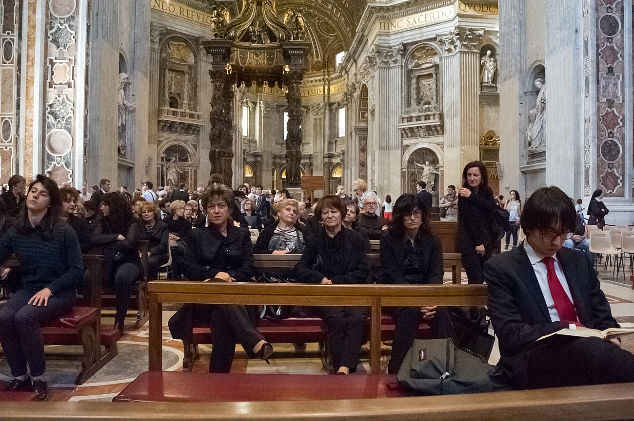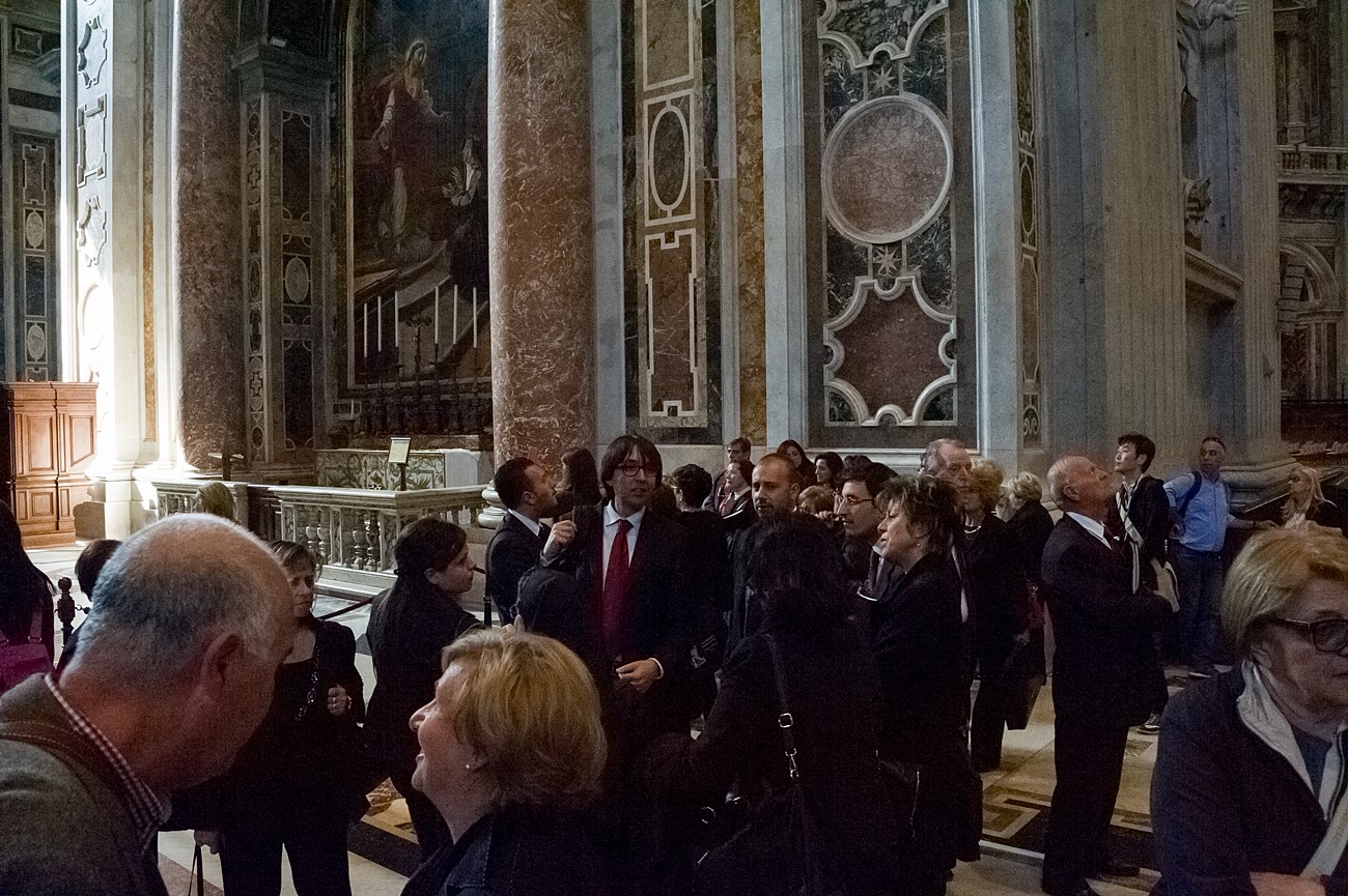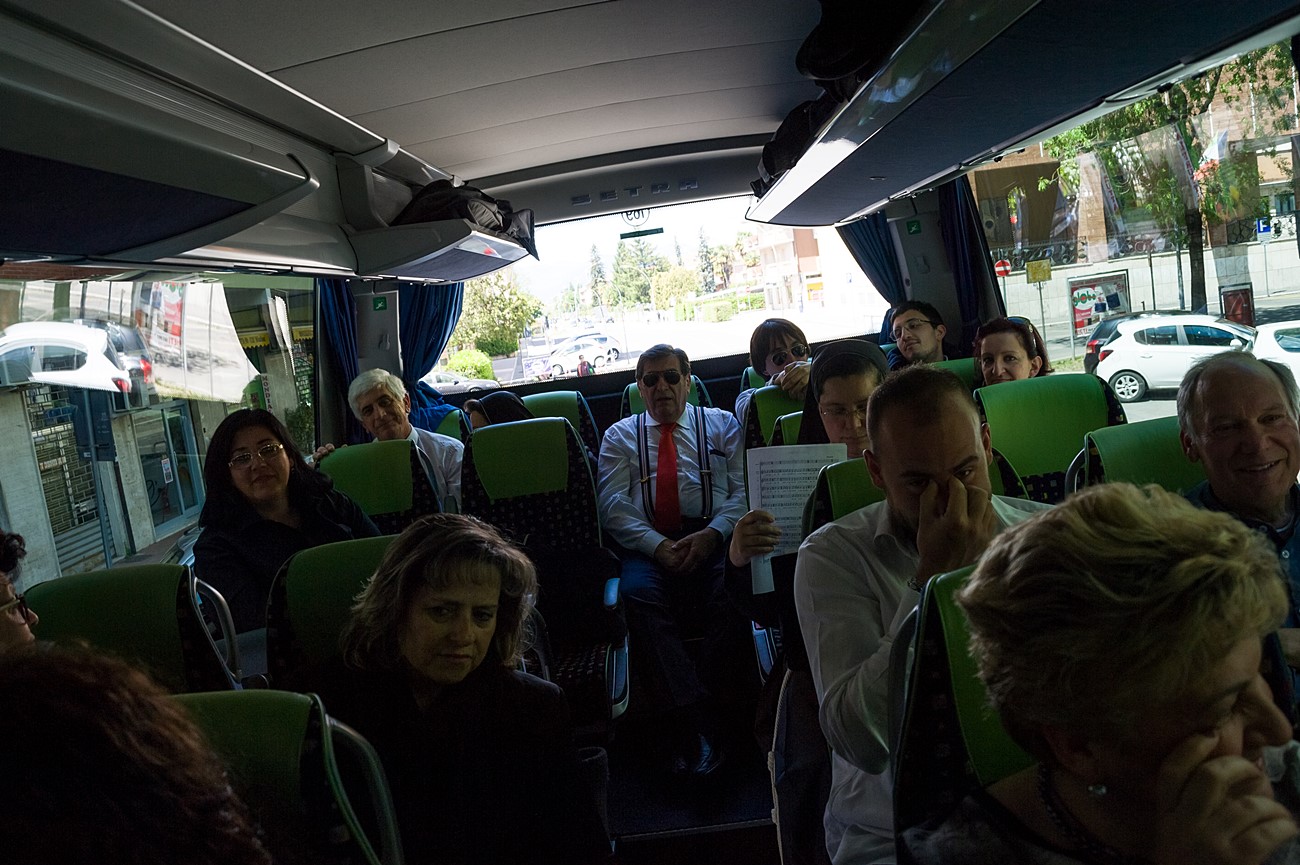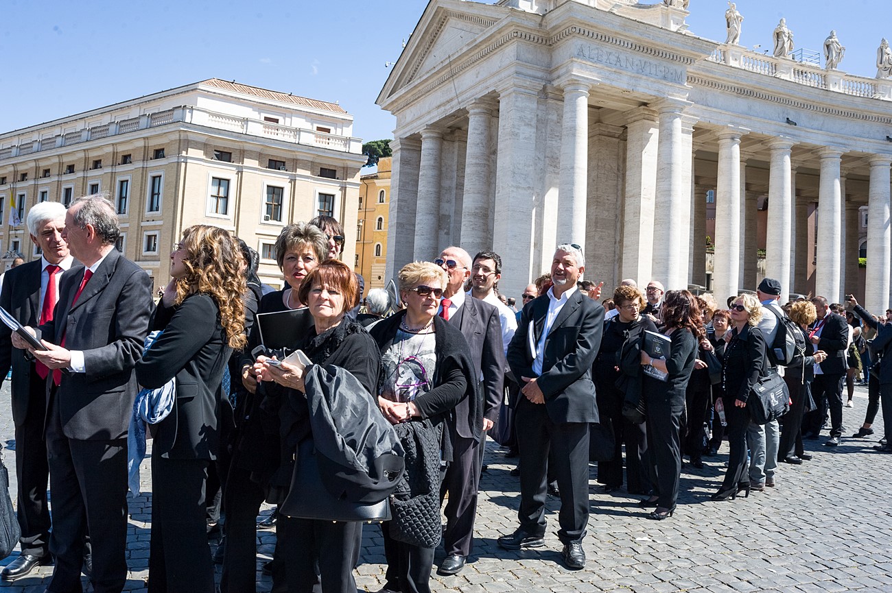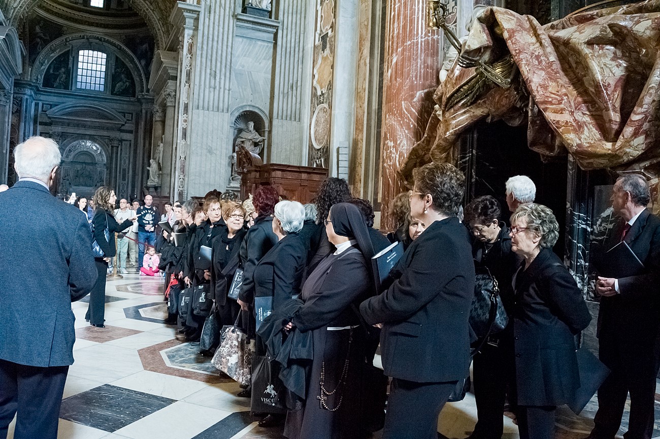 Prima di impartire la benedizione al termine della veglia, mons Pompili ha voluto espressamente ringraziare la schola per il generoso servizio prestato nei giorni faticosi eppure appaganti della Settimana Santa e soprattutto per l’aiuto che il repertorio scelto e l’atteggiamento dei coristi hanno recato alla preghiera di tutti. Per don Domenico, poco amante degli intermezzi extraliturgici all’interno delle celebrazioni, si è trattato di un gesto irrituale, che peraltro non è stato l’unico. Il grazie del vescovo non si è infatti fermato alle parole, ma si è tramutato in dono concreto: il 30 aprile, III domenica di Pasqua, grazie al suo interessamento i cantori sono stati gratificati anche con l’onore di poter animare una messa all’altare della Cattedra in San Pietro. A presiedere l’arciprete della Basilica Vaticana, il cardinale Angelo Comastri, che prima di congedare l’assemblea ha lodato il contributo del coro alla celebrazione e ha augurato alla diocesi reatina di potersi al più presto risollevare dopo il trauma del sisma che l’ha così duramente colpita. Molto soddisfatti il maestro Temistocle Capone, direttore della cappella musicale del Vicariato di San Pietro e responsabile dell’accoglienza dei cori ospiti in basilica, che ha già rinnovato l’invito per un’altra occasione, e il direttore dell’Ufficio liturgico, padre Ezio Casella, che ha accompagnato la schola nella trasferta romana e ha concelebrato insieme a un altro sacerdote reatino, don Zdenek Kopriva, a Roma con l’Azione Cattolica diocesana per i 150 anni dell’associazione. Don Roberto D’Ammando, anch’egli a Roma per lo stesso motivo, ha ripreso il suo posto fra i tenori, come sempre fa ogni volta che il nuovo incarico di vicario parrocchiale di San Giovanni Battista a Campoloniano glielo permette.
