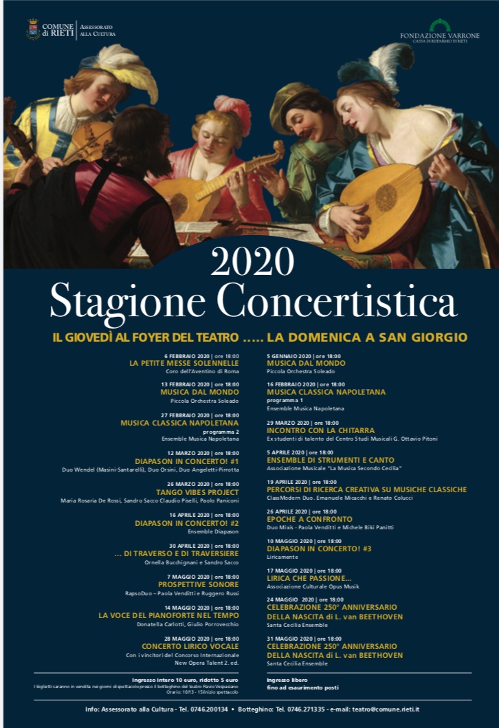 «Questo è il terzo anno che programmiamo una stagione concertistica – dice l’assessore Gianfranco Formichetti – la novità è la collaborazione con la Fondazione Varrone, che ci ha consentito di raddoppiare gli appuntamenti, così da animare la vita culturale della città anche in mesi tradizionalmente meno ricchi di proposte e di offrire a belle realtà locali la ribalta che meritano».
