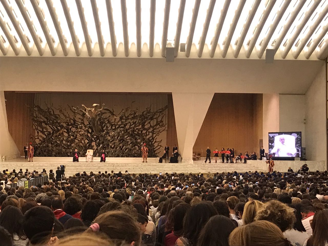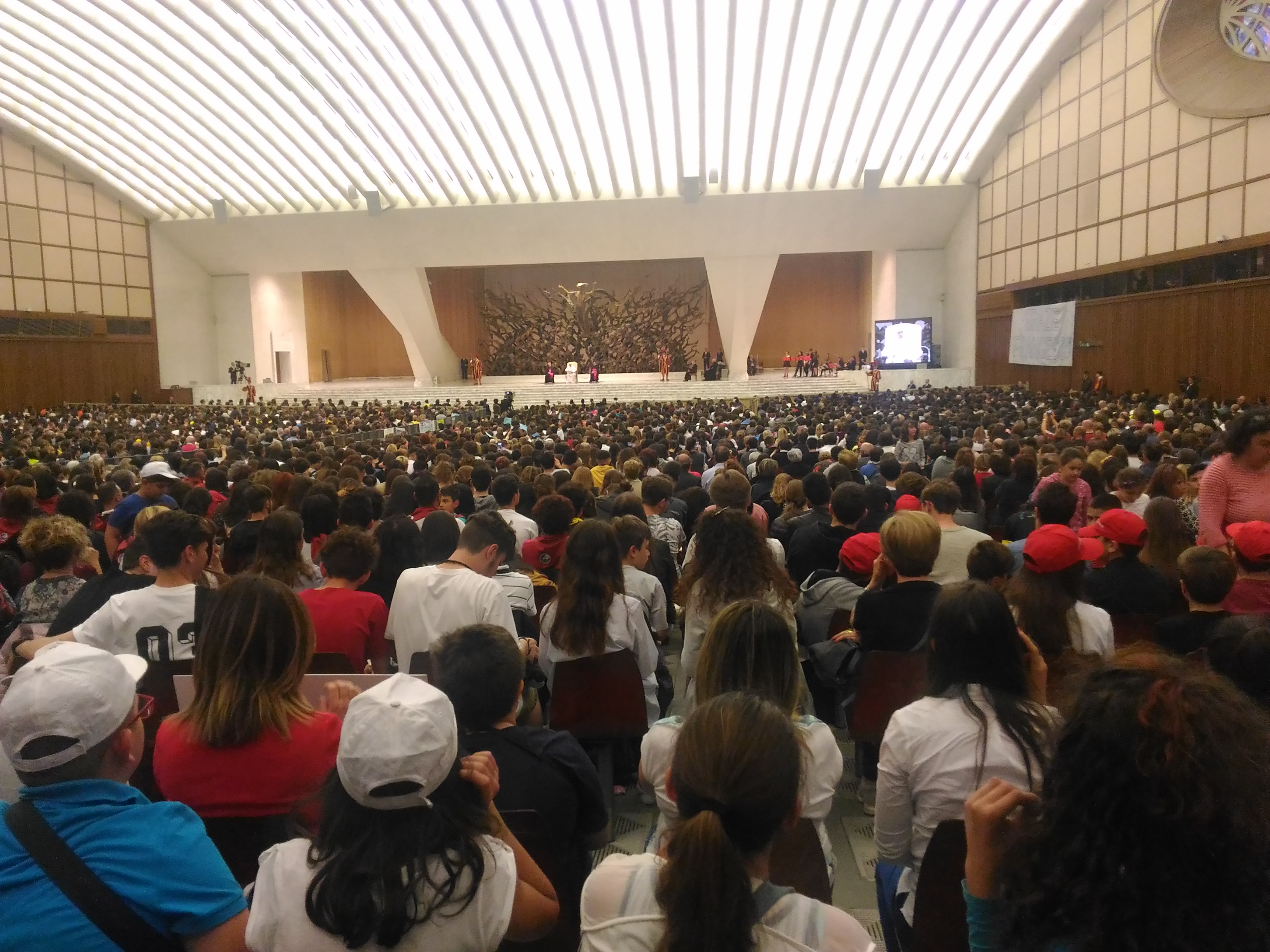 Nella grande e accogliente aula dedicata a Papa Paolo VI, hanno trovato posto tantissimi giovani, bambini e docenti di tante scuole d’Italia per incontrare Papa Bergoglio, il quale ha suscitato in tutti forti emozioni e tanta allegria. Dopo un intermezzo musicale, alcuni interventi da parte degli organizzatori e le parole di Valeria Fedeli, ministro della Pubblica Istruzione, il Pontefice non si è sottratto ai quesiti postegli da cinque studenti e un docente. «Cosa sta succedendo?» Questa la domanda fondamentale posta al Papa rispetto a importanti problemi che riguardano l’umanità intera e ogni singolo uomo: la custodia del creato, il rispetto dei più deboli, la discriminazione di alcune categorie sociali, la diffusa povertà. Sembra non avere mai fine la fame di denaro e di potere. Cosa sta succedendo?