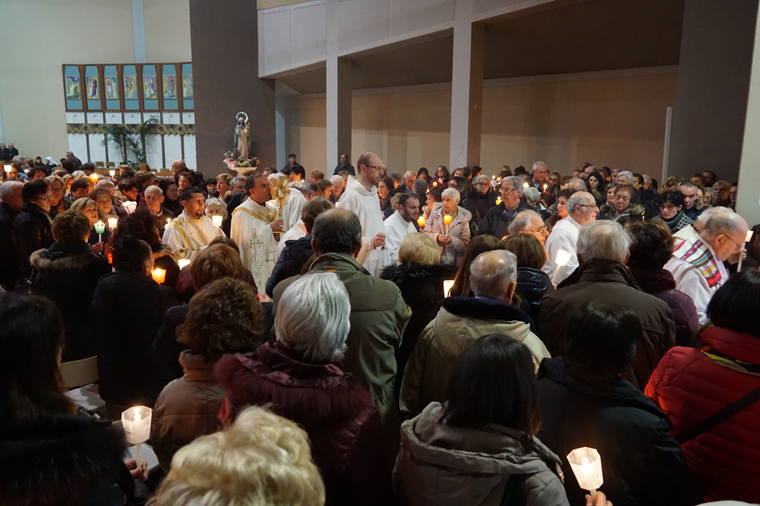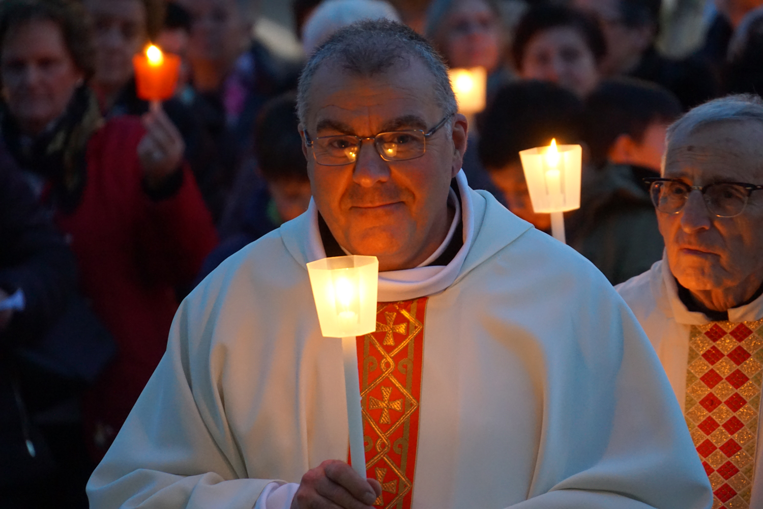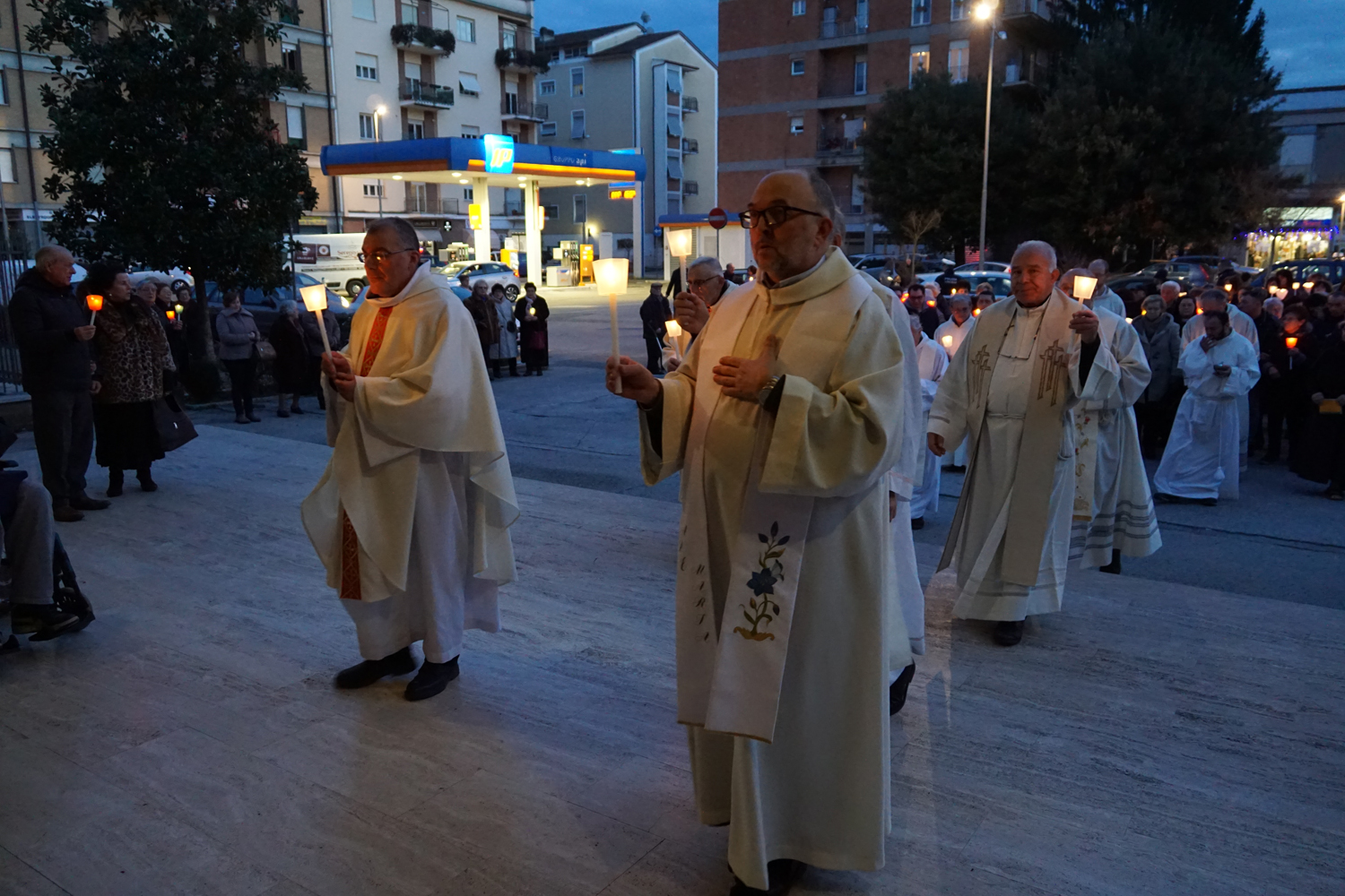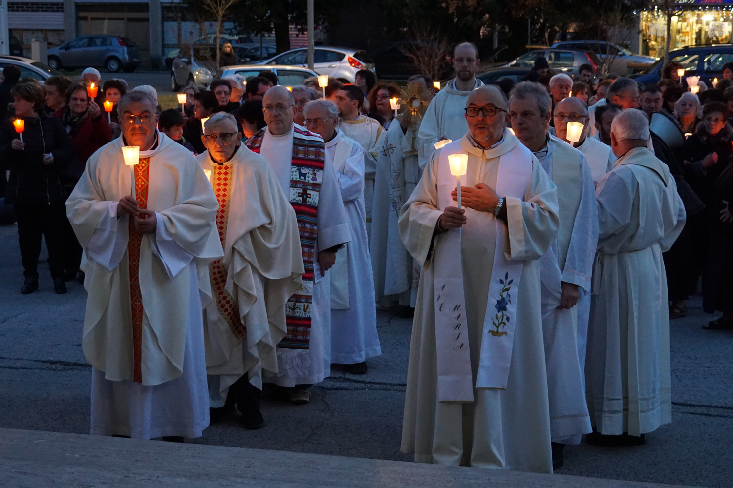Il pensiero è andato a lui in particolare durante la processione eucaristica che è seguita alla Messa, ricordando quando guidava la preghiera innalzando le classiche acclamazioni tipiche delle processioni nell’ésplanade di Lourdes. Con canti e preghiere, tutti i partecipanti hanno sfilato nel portare il Santissimo Sacramento nelle strade attorno al complesso parrocchiale, per poi rientrare e concludere con la preghiera di adorazione conclusiva, la benedizione eucaristica e il suggestivo canto dell’Ave di Lourdes caratterizzato, come nel santuario francese, dal tenere in alto i flambeaux accesi durante il ritornello.