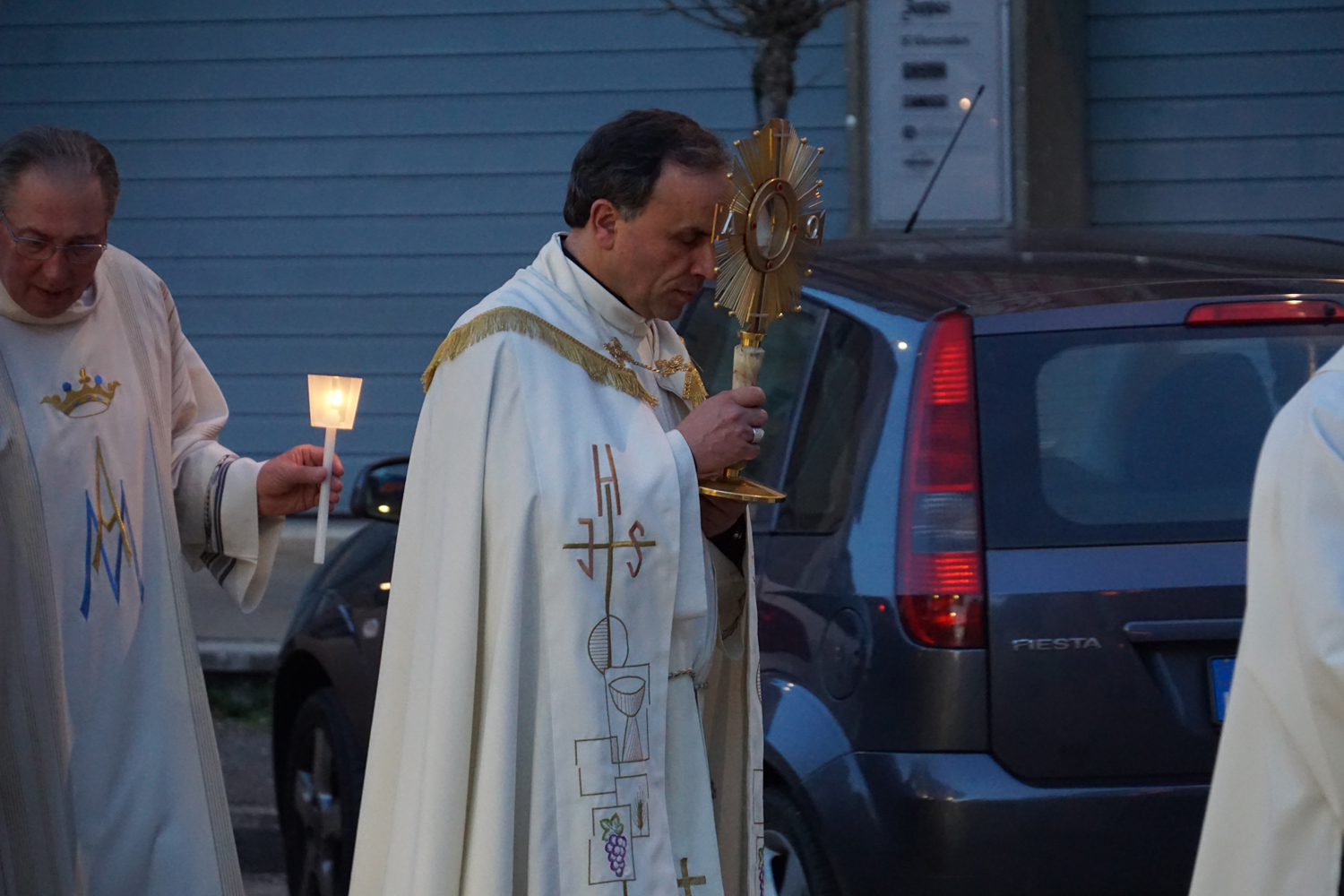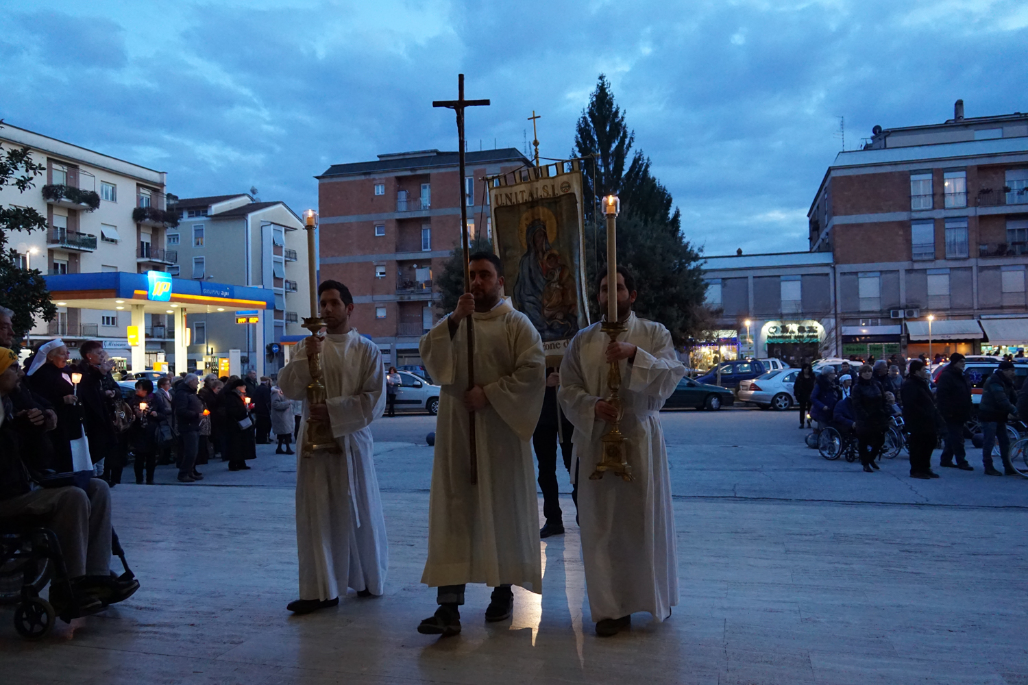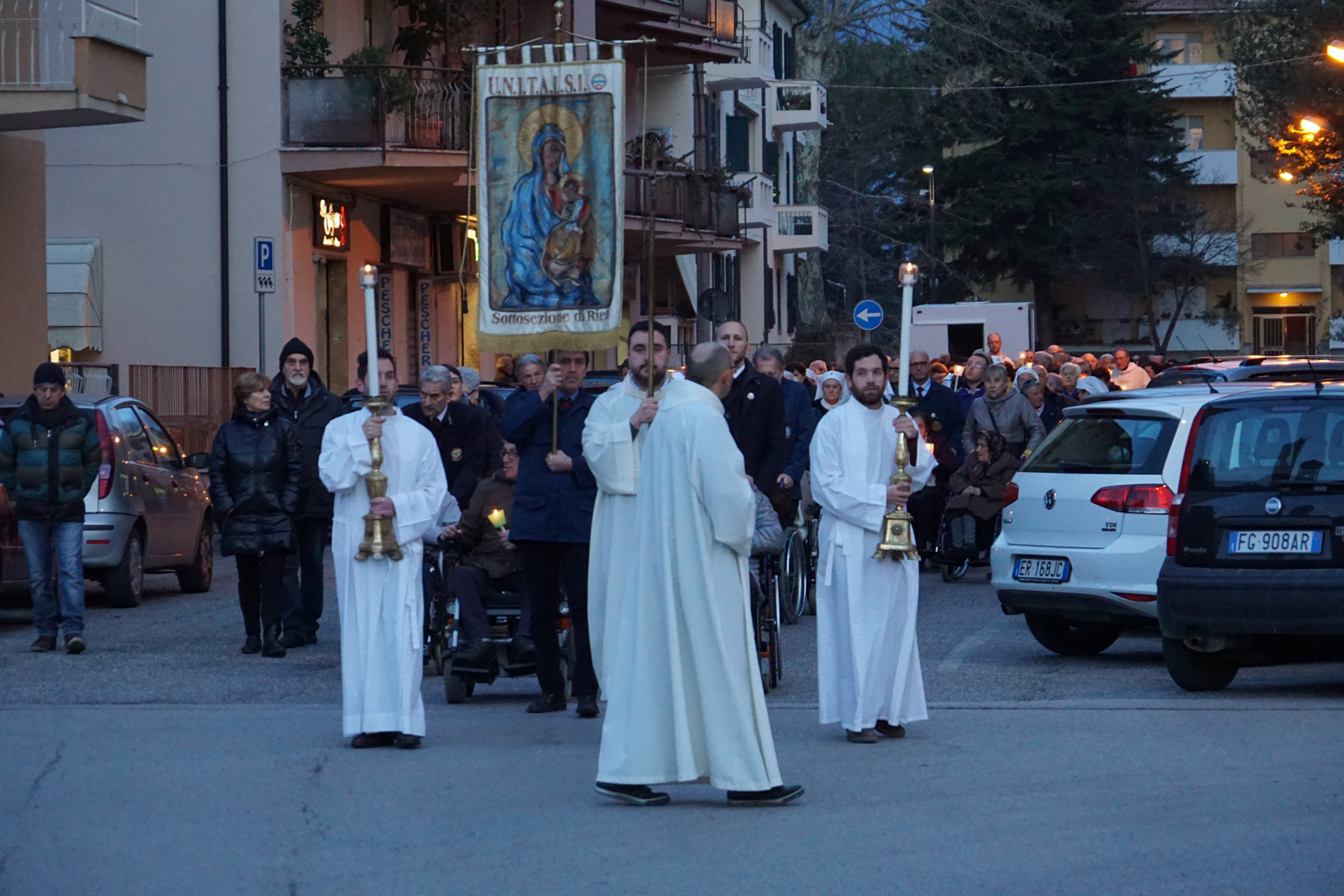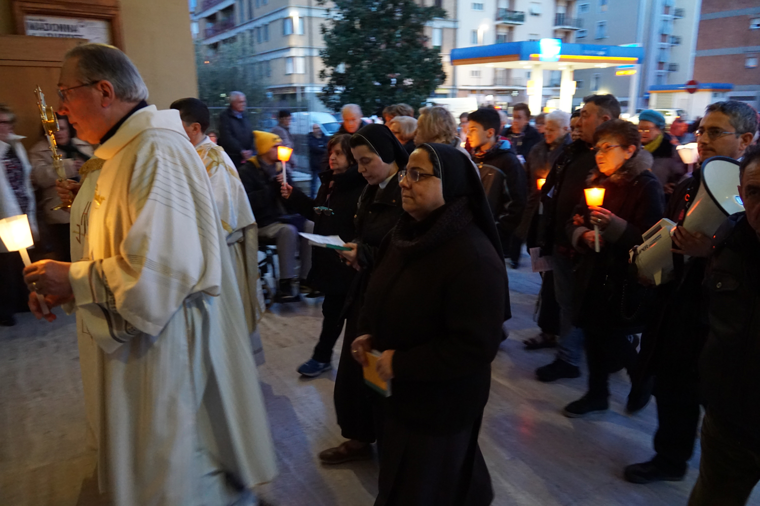 Il pensiero è andato a lui in particolare durante la processione eucaristica che è seguita alla Messa, ricordando quando guidava la preghiera innalzando le classiche acclamazioni tipiche delle processioni nell’ésplanade di Lourdes. Con canti e preghiere, tutti i partecipanti hanno sfilato nel portare il Santissimo Sacramento nelle strade attorno al complesso parrocchiale, per poi rientrare e concludere con la preghiera di adorazione conclusiva, la benedizione eucaristica e il suggestivo canto dell’Ave di Lourdes caratterizzato, come nel santuario francese, dal tenere in alto i flambeaux accesi durante il ritornello.