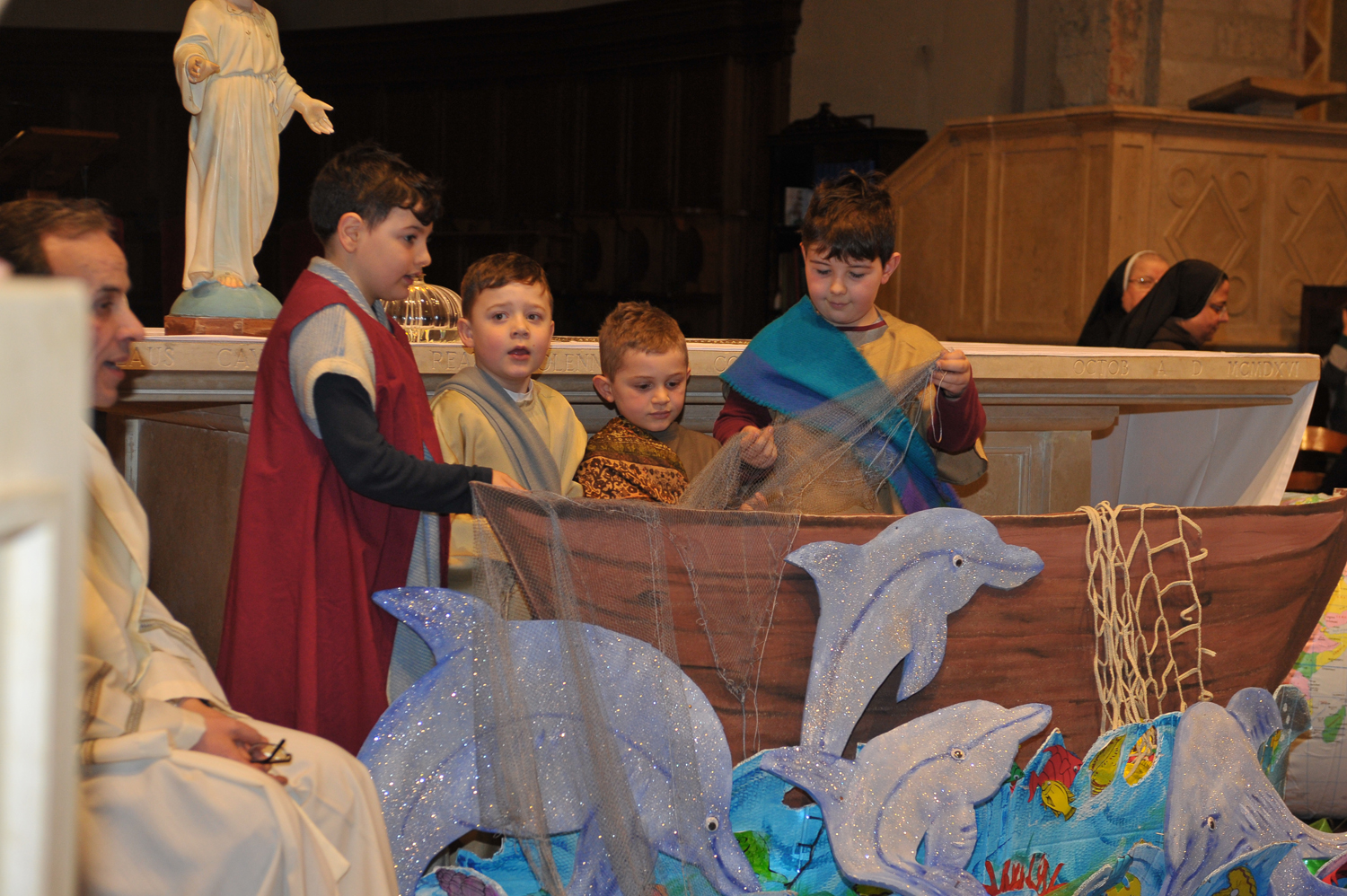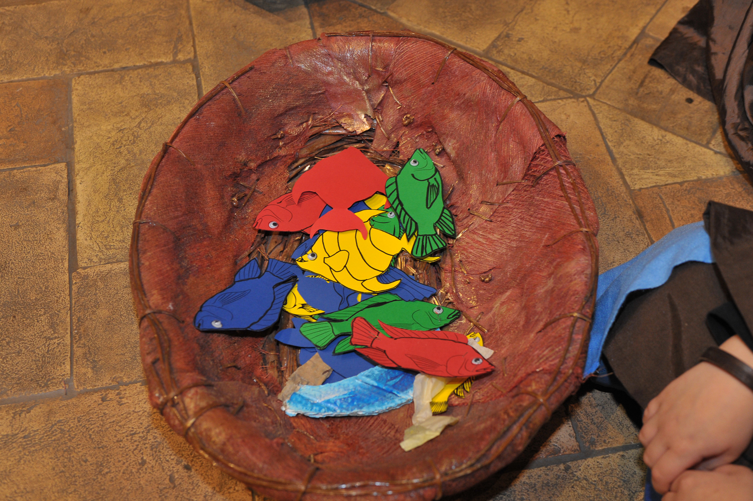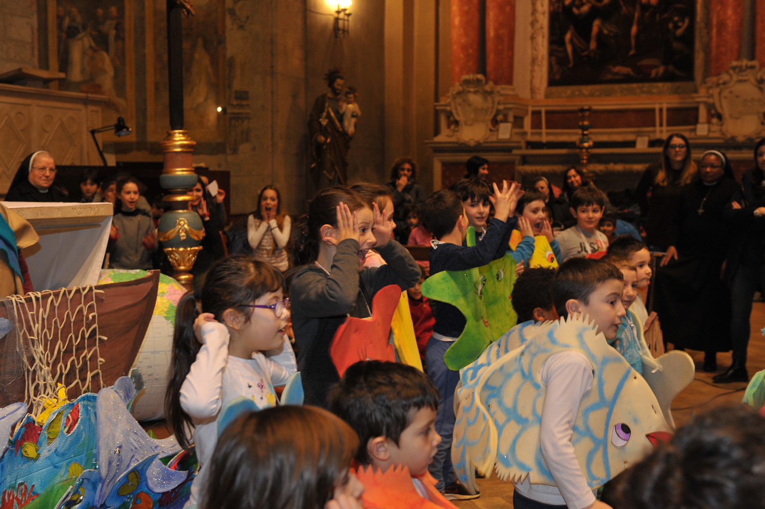 Ad ottenere la massima attenzione dei giovanissimi è stato il passo evangelico della pesca miracolosa, che non è stato letto, ma messo in scena grazie all’impegno di alcuni coetanei e alla guida di suor Elisabeth e suor Donata, coordinate dall’ufficio diocesano dedicato alle missioni, che ha contribuito alla colorata scenografia con la barca, le reti, i pesci.