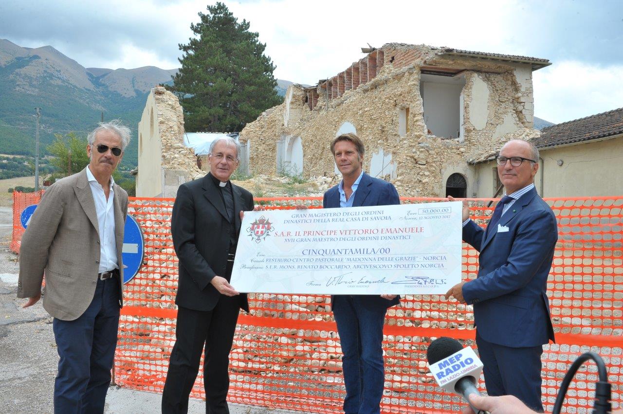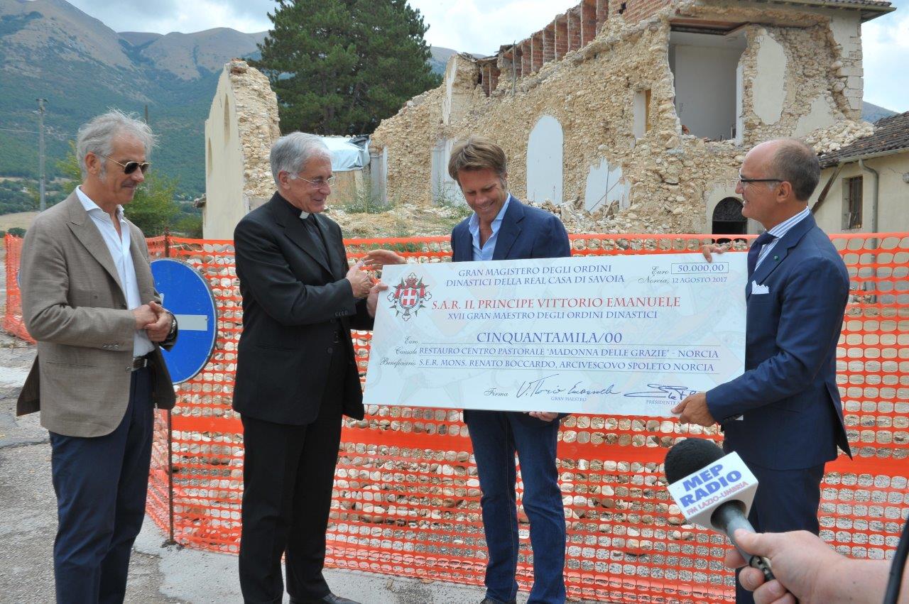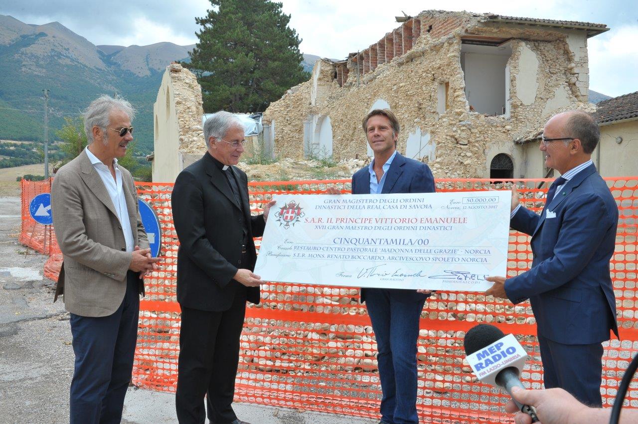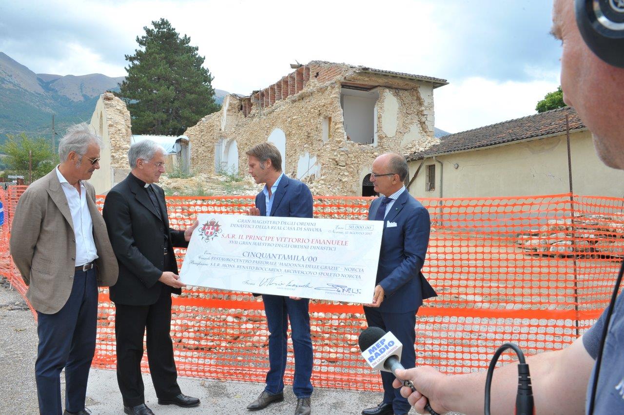 Ammonta a 50mila euro la donazione con cui gli Ordini dinastici di Casa Savoia sosterranno il restauro del centro pastorale “Madonna delle Grazie” di Norcia. La somma è stata consegnata da Emanuele Filiberto di Savoia, principe di Piemonte e di Venezia, all’arcivescovo di Spoleto-Norcia, mons. Renato Boccardo, sabato 12 agosto, alle 12, presso il complesso oggetto del restauro.