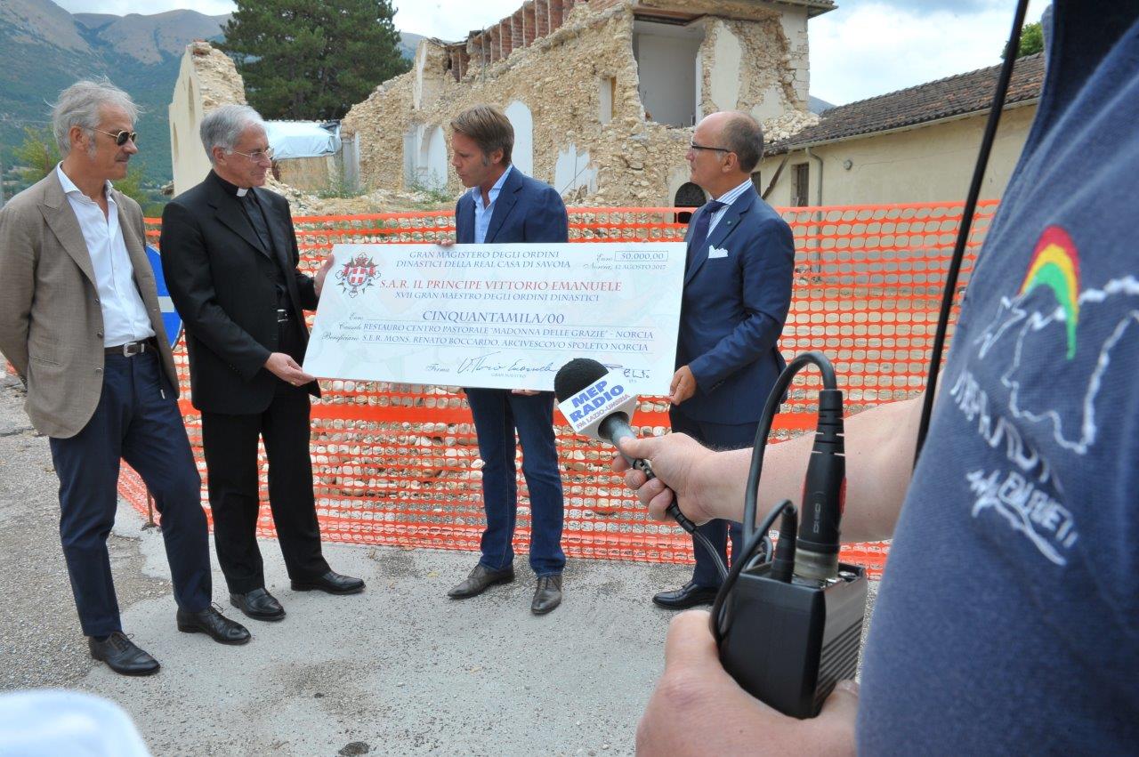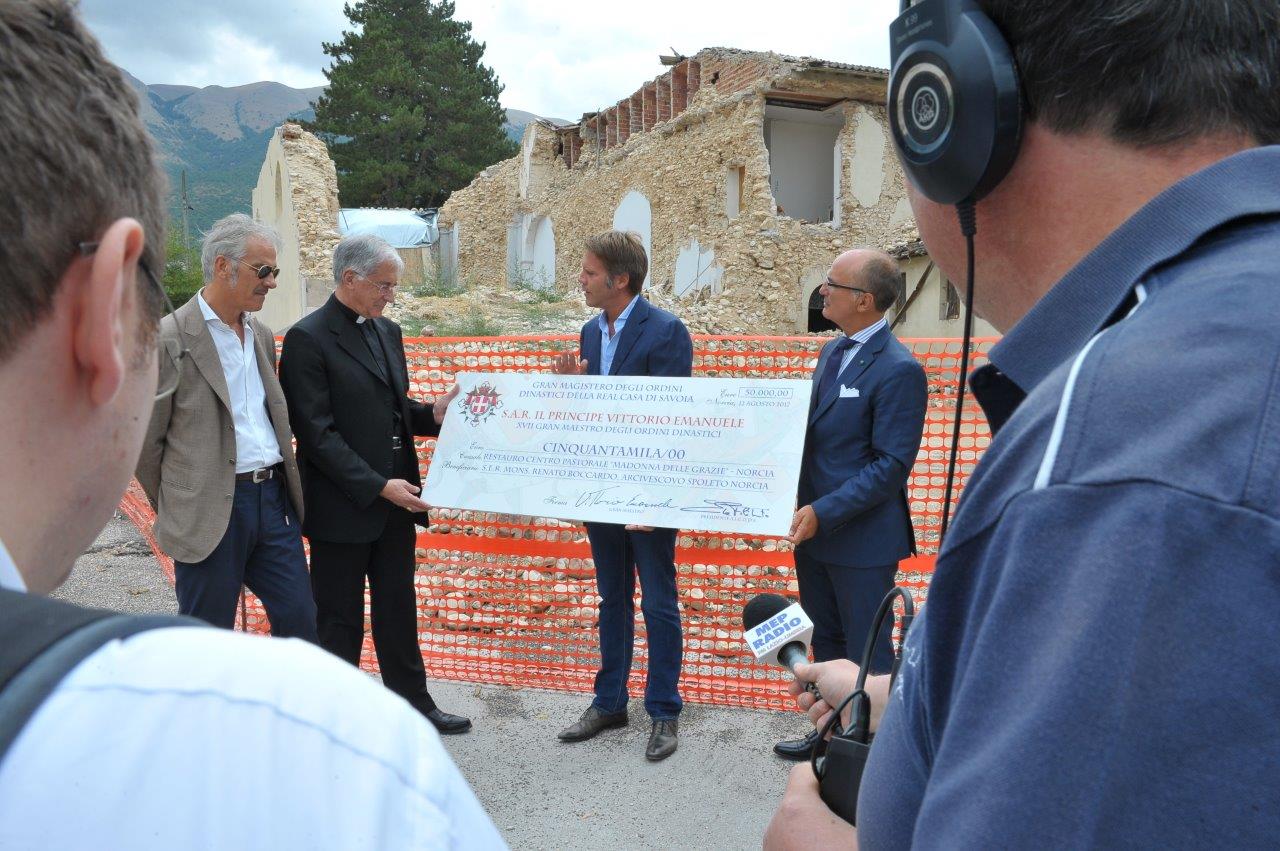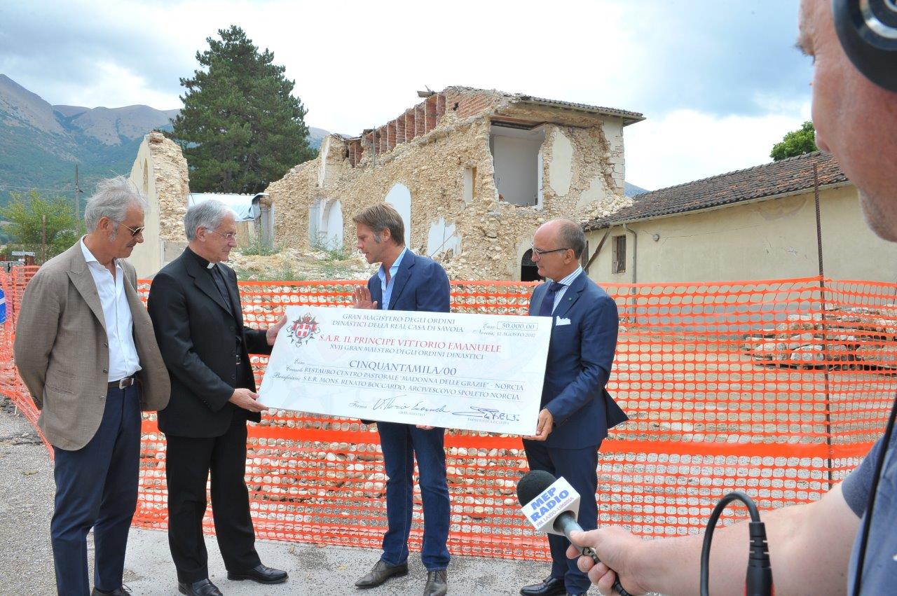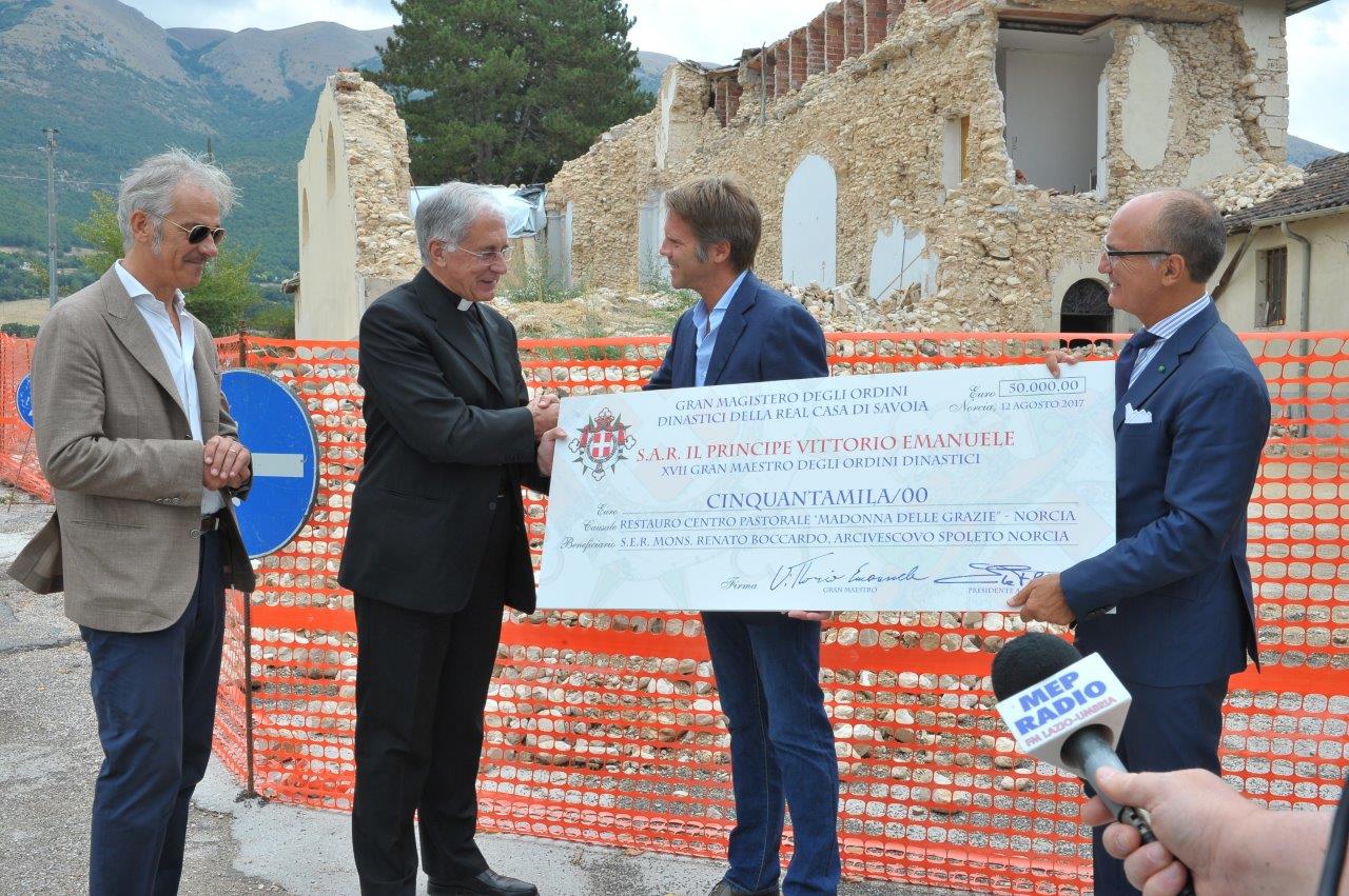 Ammonta a 50mila euro la donazione con cui gli Ordini dinastici di Casa Savoia sosterranno il restauro del centro pastorale “Madonna delle Grazie” di Norcia. La somma è stata consegnata da Emanuele Filiberto di Savoia, principe di Piemonte e di Venezia, all’arcivescovo di Spoleto-Norcia, mons. Renato Boccardo, sabato 12 agosto, alle 12, presso il complesso oggetto del restauro.