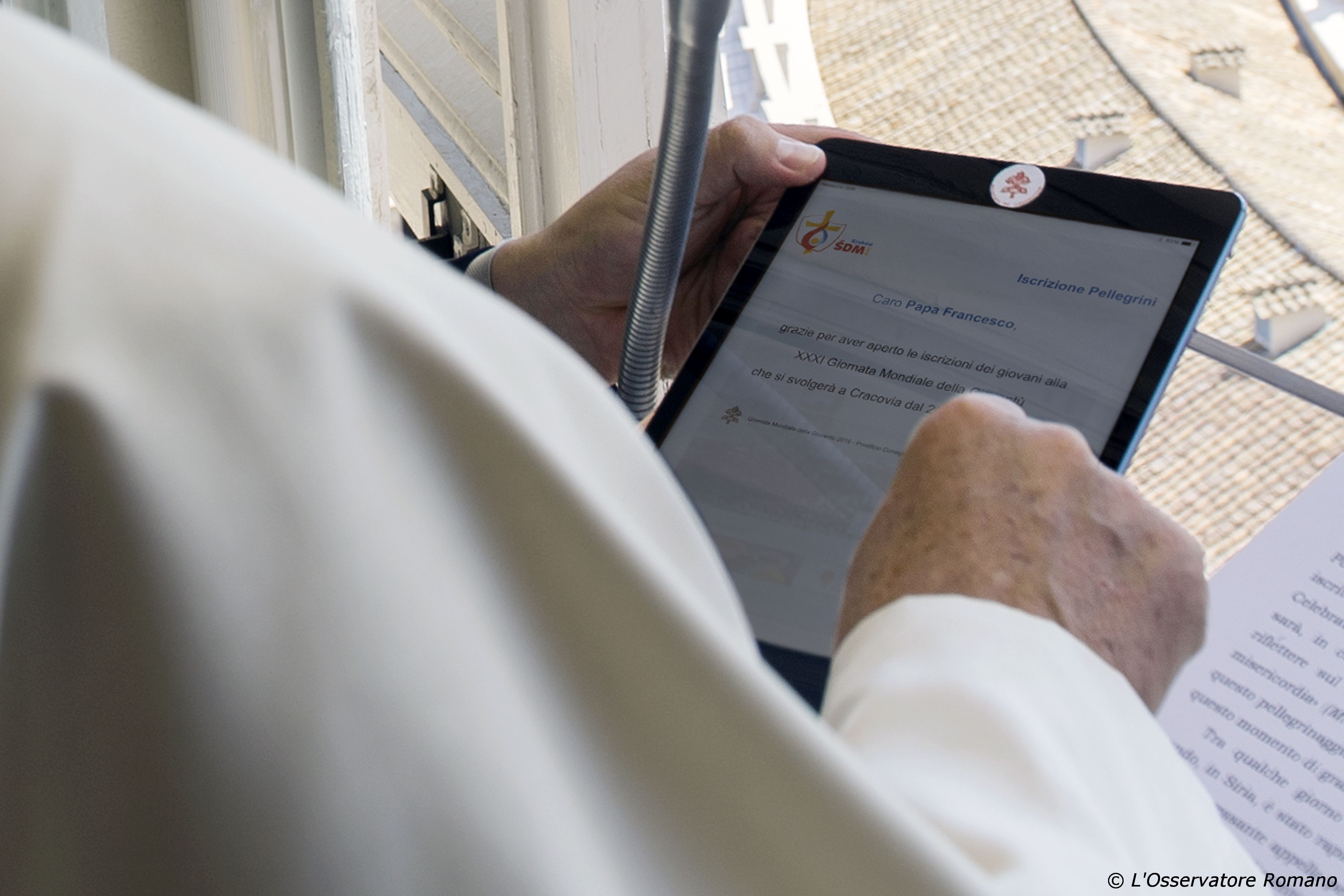Dopo aver dato l’annuncio ufficiale dell’apertura delle iscrizioni, il Santo Padre ha compilato il modulo su un tablet, portatogli appositamente alla finestra del suo studio al palazzo apostolico. Simbolicamente al suo fianco, un ragazzo e una ragazza della diocesi di Cracovia, che ospiterà al GMG dal 26 al 31 luglio 2016.