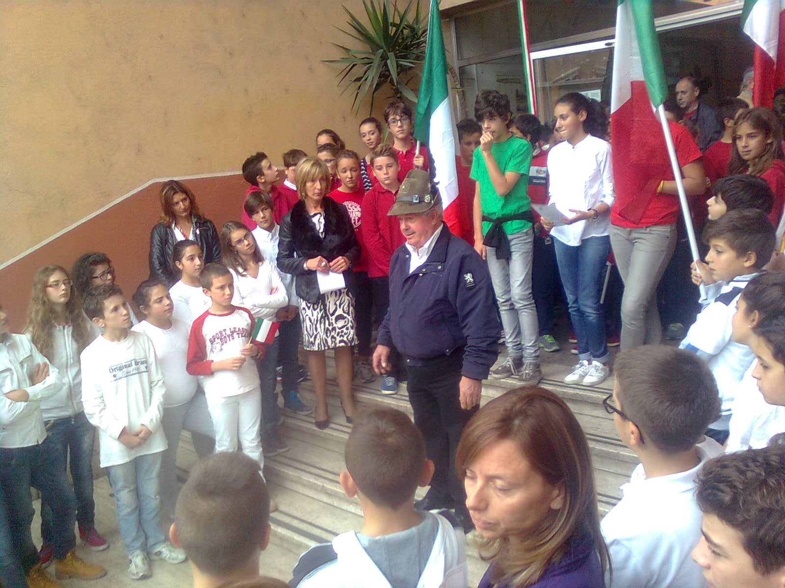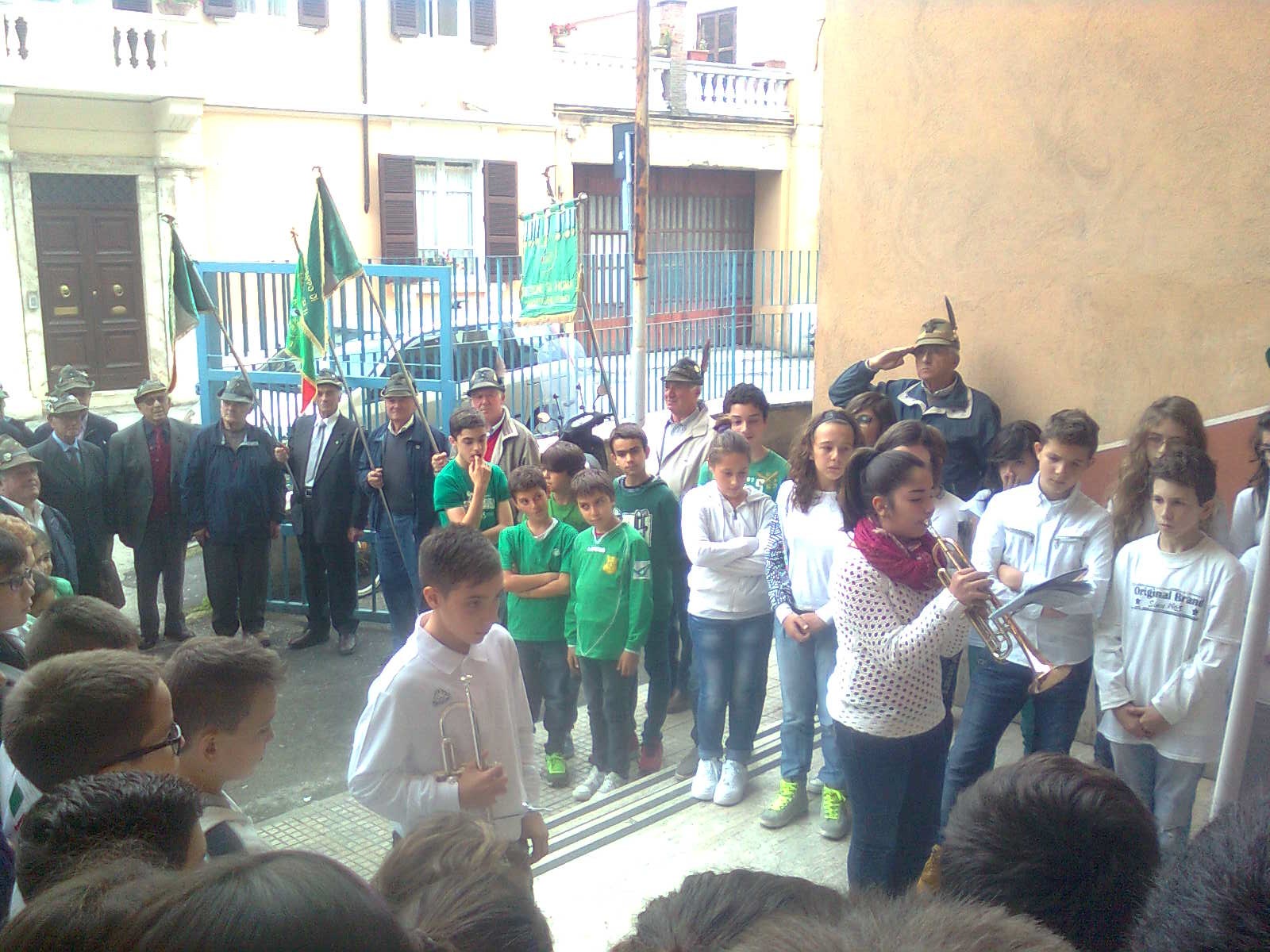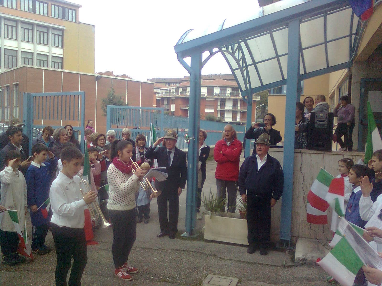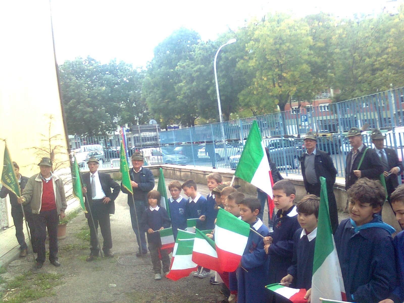 Due alunni trombettieri per gli squilli e l’inno di Mameli, altri allievi scelti per leggere le parole poetiche dedicate alla cara bandiera bianco-rosso-verde, il saluto dei docenti coordinatori in rappresentanza della dirigente scolastica, il saluto del presidente dell’associazione Alpini, con la presenza di vari esponenti dei gruppi della provincia e anche di un gruppo romano con il gagliardetto decorato al valor militare; non mancava il parroco del quartiere don Luigi Bardotti.