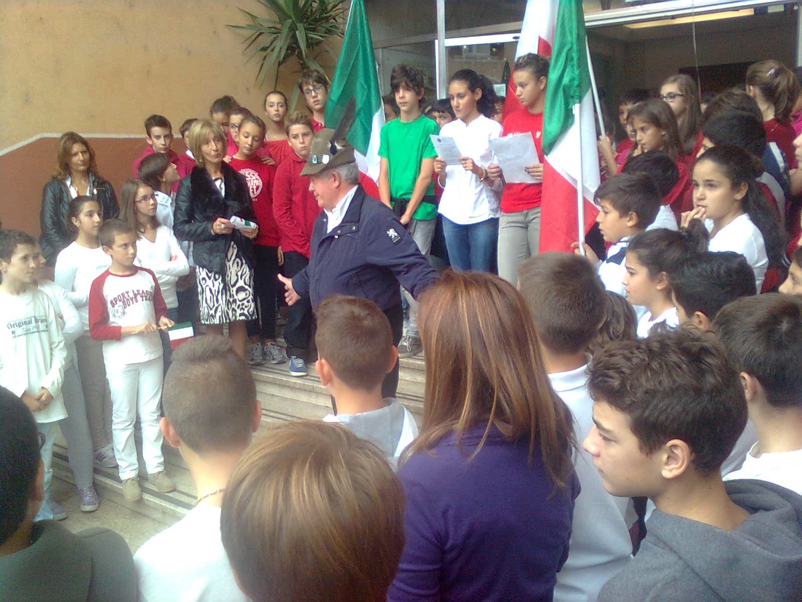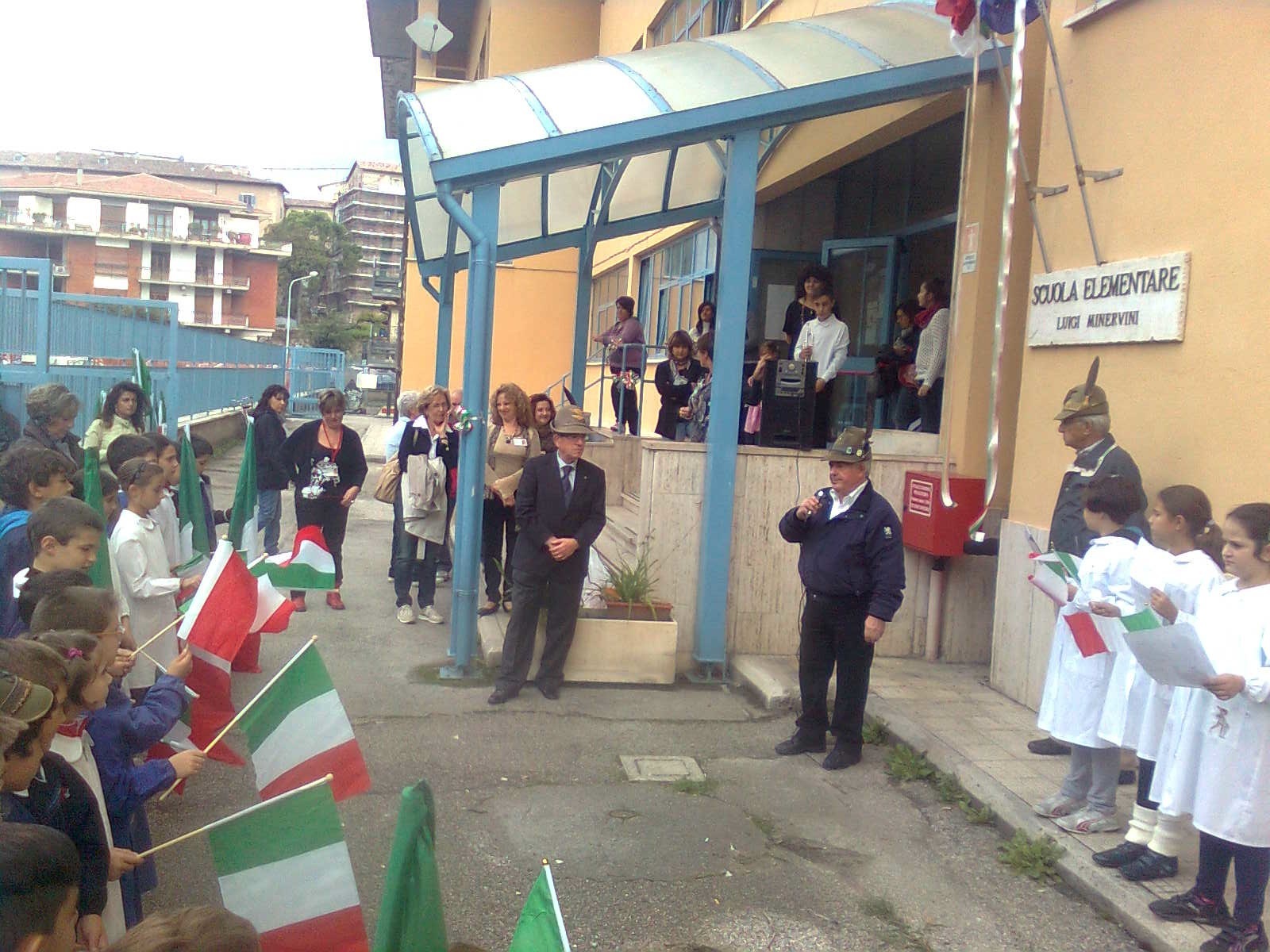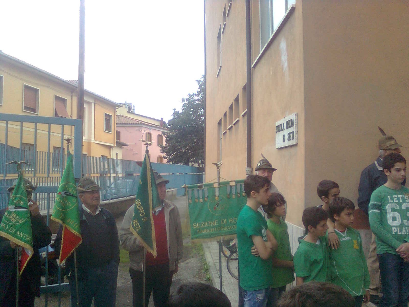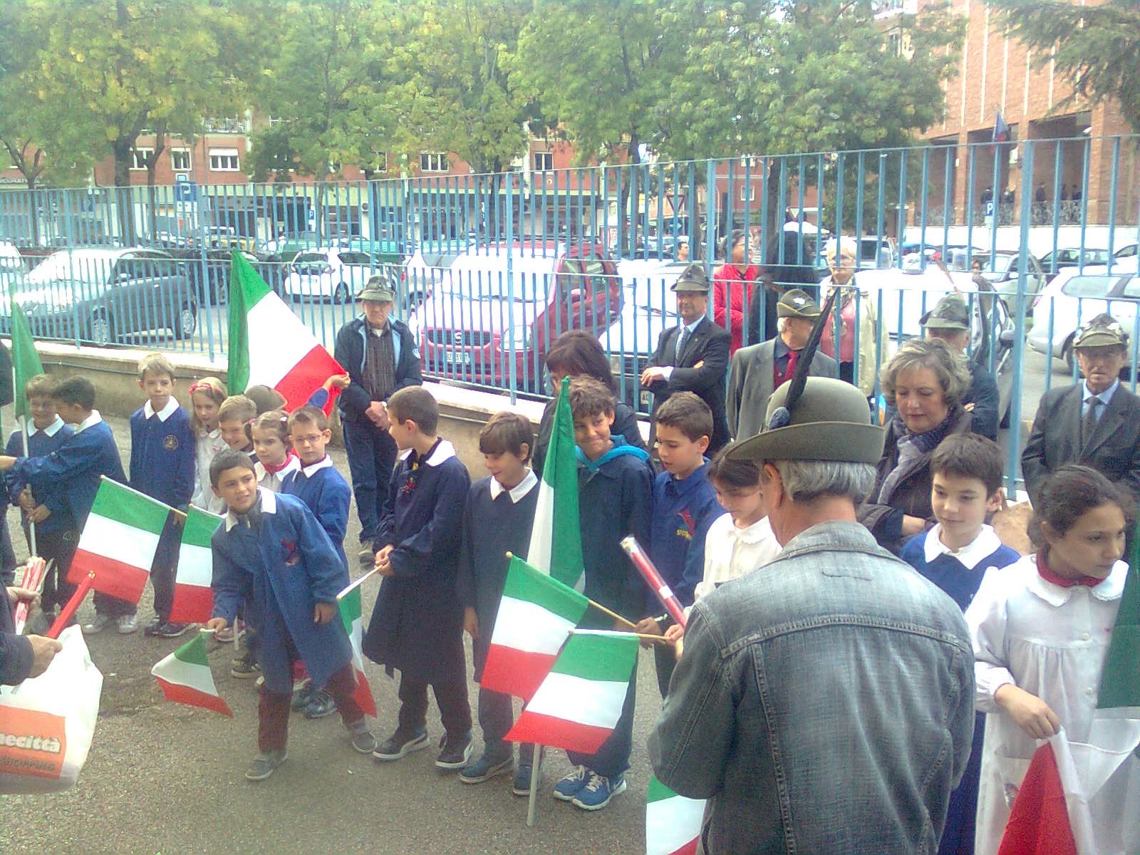Due alunni trombettieri per gli squilli e l’inno di Mameli, altri allievi scelti per leggere le parole poetiche dedicate alla cara bandiera bianco-rosso-verde, il saluto dei docenti coordinatori in rappresentanza della dirigente scolastica, il saluto del presidente dell’associazione Alpini, con la presenza di vari esponenti dei gruppi della provincia e anche di un gruppo romano con il gagliardetto decorato al valor militare; non mancava il parroco del quartiere don Luigi Bardotti.
