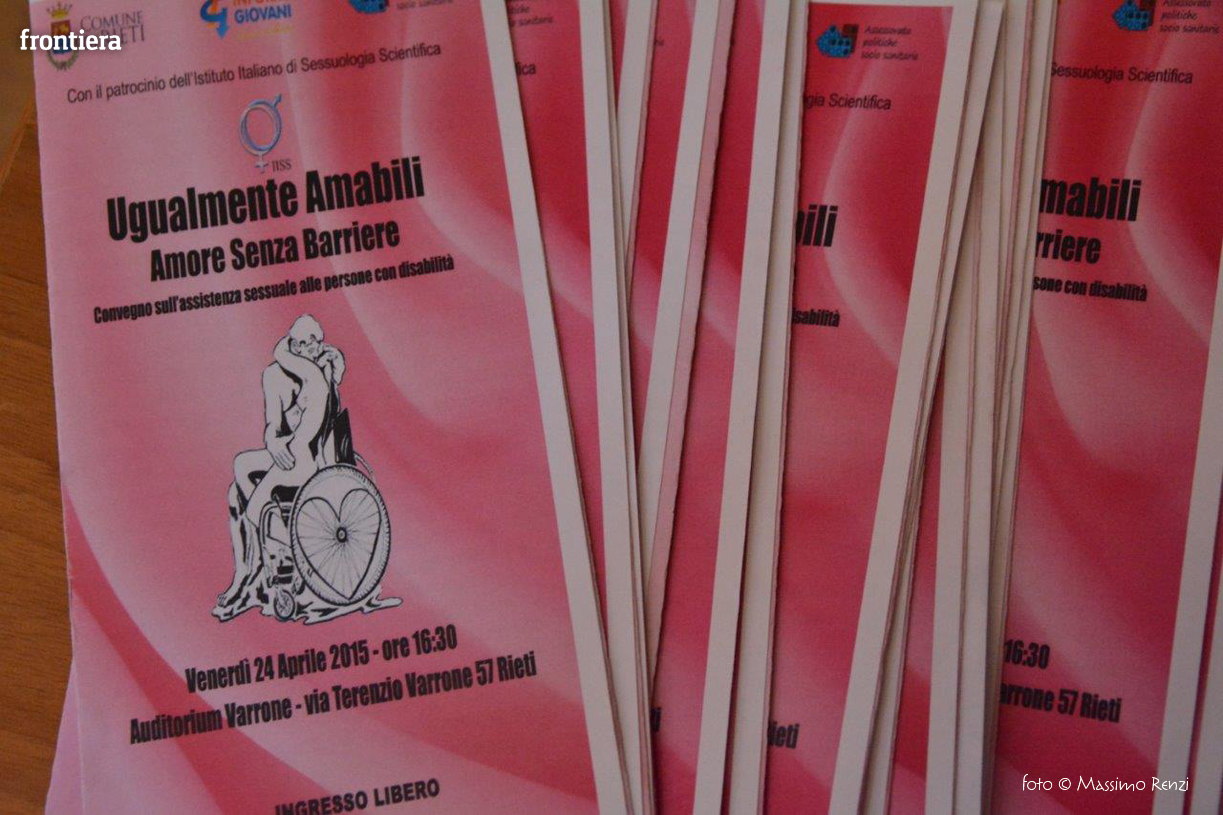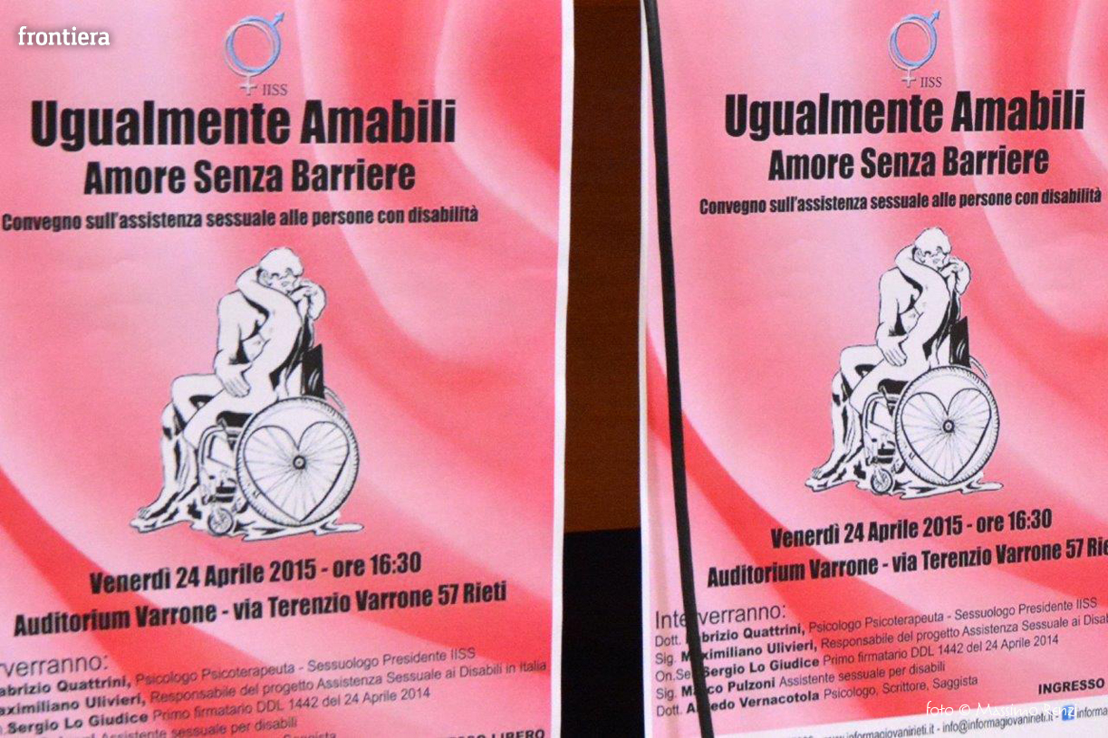 Si è svolto venerdì 24 aprile presso l’Auditorium Varrone il convegno “Ugualmente Amabili – Amore senza barriere”, organizzato dai Volontari del Servizio Civile Nazionale in forza presso l’Informagiovani del Comune di Rieti. Un meeting scientifico che ha visto coinvolti i maggiori esponenti del Progetto Assistenza Sessuale ai Disabili in Italia, che hanno affrontato la tematica delle relazioni sentimentali e sessuali nelle persone con disabilità fisiche e/o psichiche.