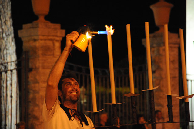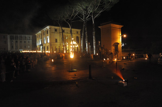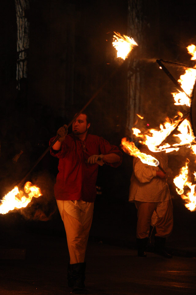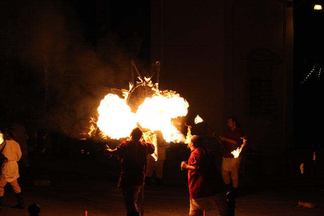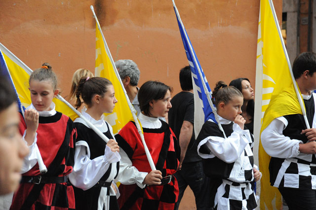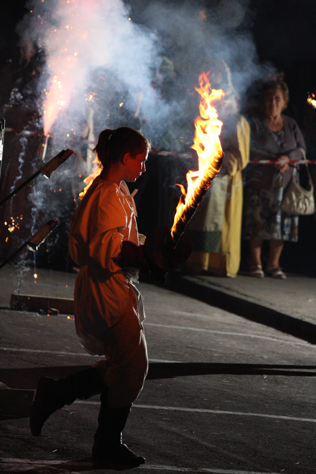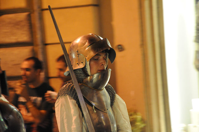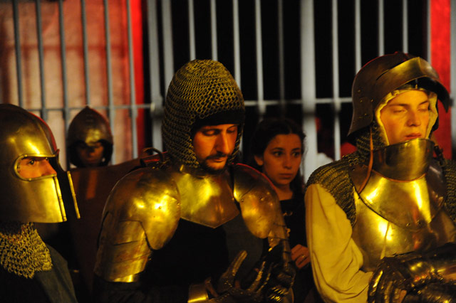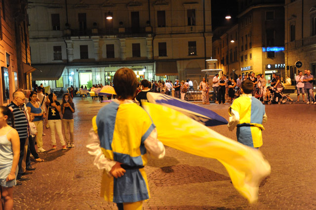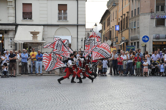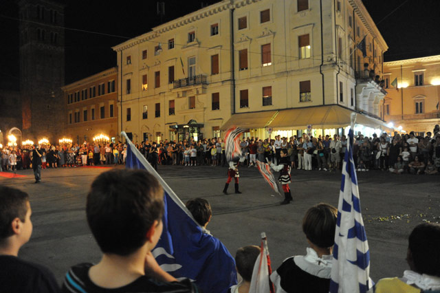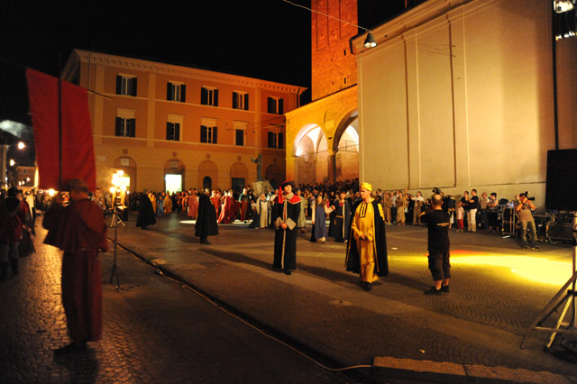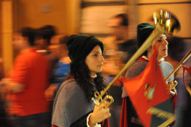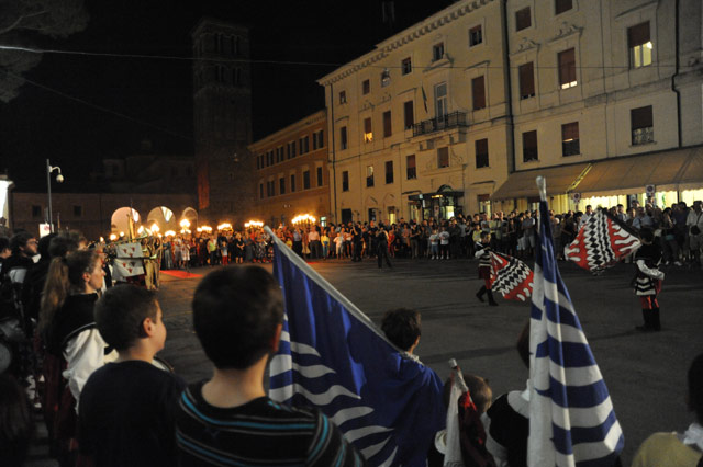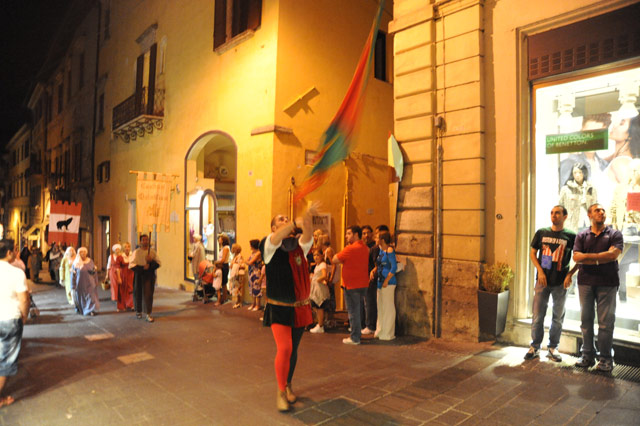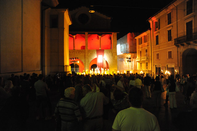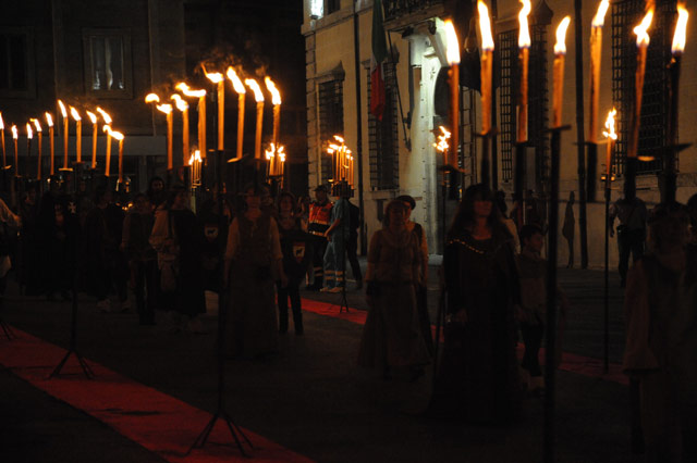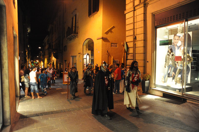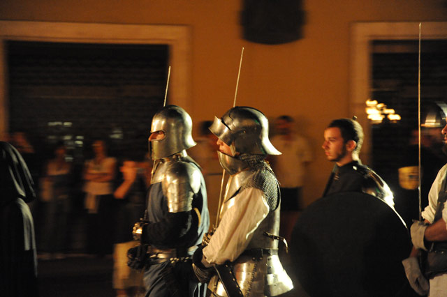 Qualcuno ci rimprovera di non disporre spalti e gradinate per poter permettere a tutti di seguire comodamente. Il fatto è che questo tipo di approccio non ci interessa. Non vogliamo “ordinare” il pubblico, disporlo su scale e gerarchie, né bloccarlo in una situazione. Mano a mano che crescono le nostre possibilità e capacità progettuali, l’evento della rievocazione si espande sulla città con più interventi, anche contemporanei. Il nostro pubblico ideale è fluido, mobile. Vogliamo trovarlo e perderlo. Vogliamo stimolare la curiosità e la voglia di vedere: per seguirci il pubblico deve partecipare, muoversi e sudare, mescolarsi ai fatti rappresentati. Solo così si dà autentica rievocazione: la rappresentazione diventa un vissuto, un approccio da tentare, la proposta di una prassi.