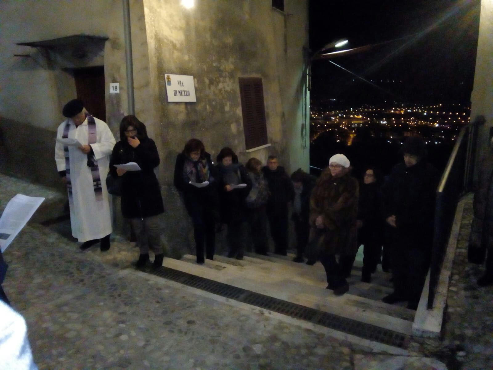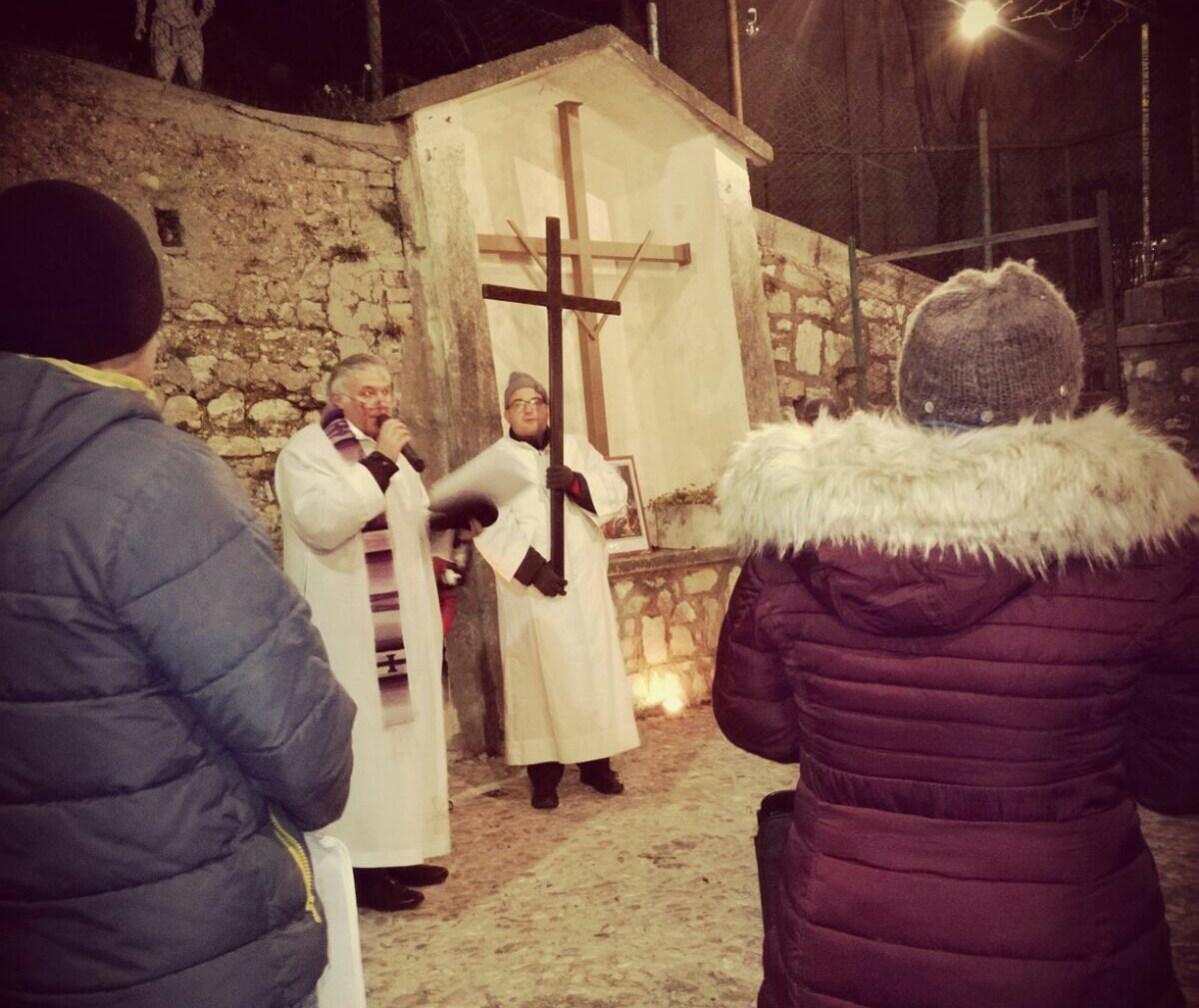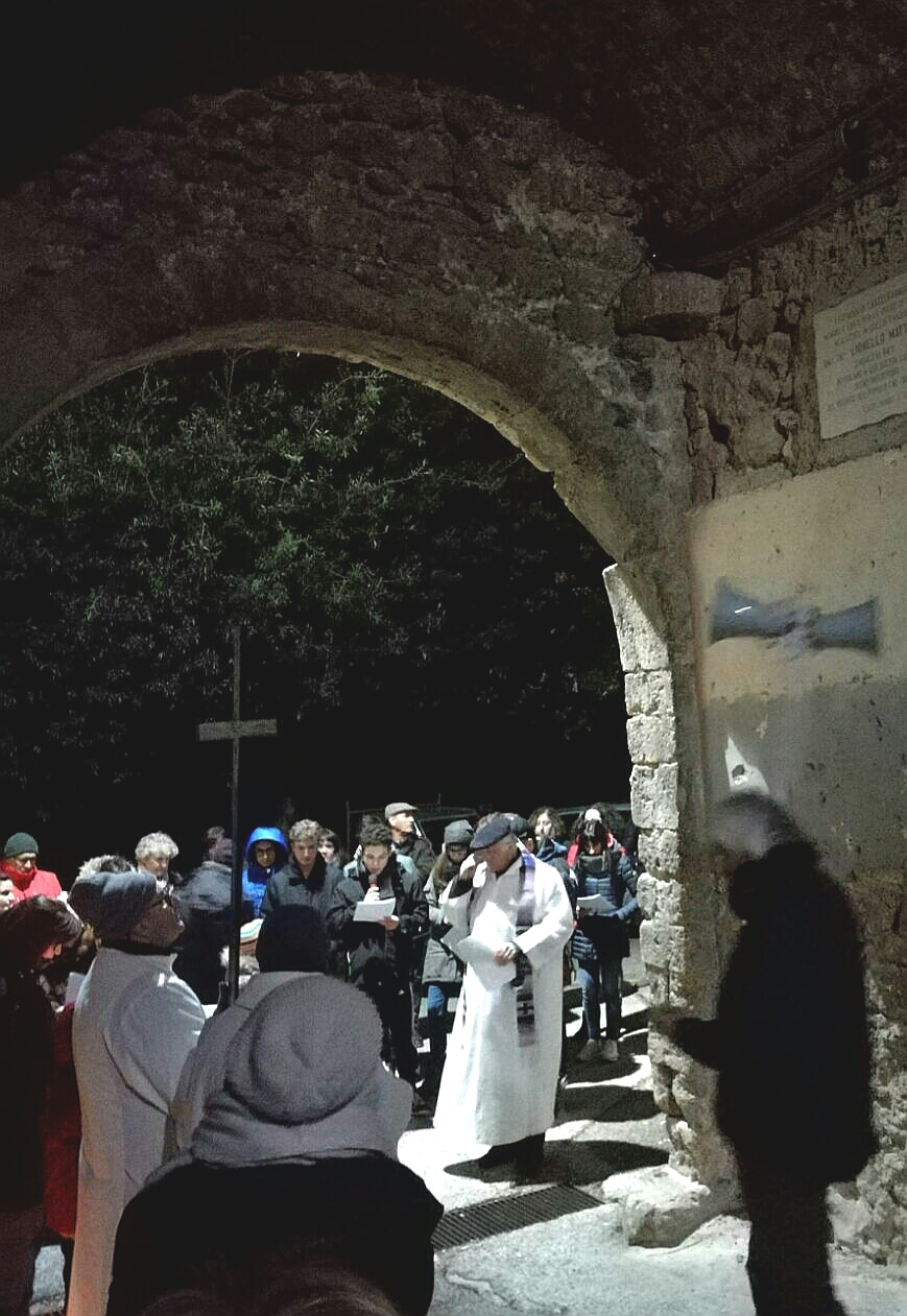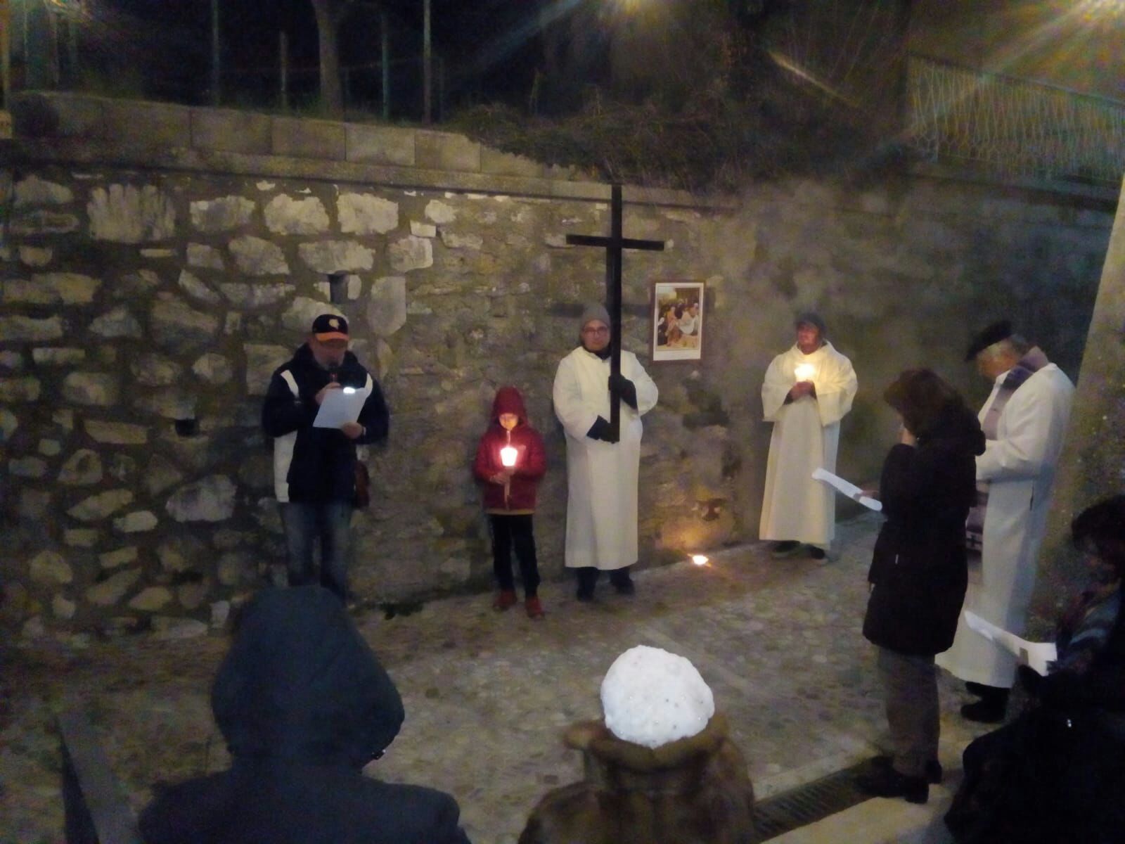 L’occasione ha visto la presenza di un nutrito gruppo di fedeli provenienti da tutte le frazioni che compongono l’estesa parrocchia Santa Maria delle Grazie: Lisciano, Lugnano, Coccodrillo, Cupaello, Madonna del Passo, Castelfranco e Vazia. Nella fredda notte stellata i cuori hanno battuto all’unisono nell’ascolto della Parola di Dio, nella devota esecuzione delle preghiere e dei canti della tradizione e nell’ascolto delle icone drammatiche raffiguranti le tante croci che segnano il cammino dell’esistenza odierna.