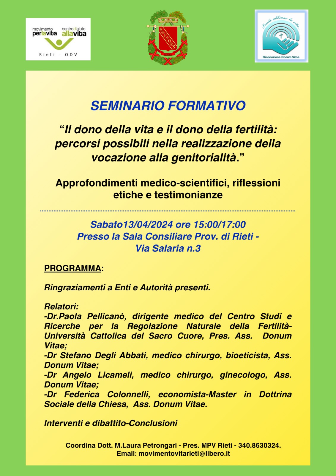 L’Aula Consiliare della Provincia di Rieti ospiterà un seminario sulle tematiche di vita e di fertilità. L’iniziativa vede la collaborazione tra il Movimento Per la Vita e l’Associazione Donum Vitae e pone l’accento sulla conoscenza e sulla prevenzione in ambito della fertilità, invitando a una riflessione profonda sui valori della genitorialità e sull’importanza di una consapevolezza precoce.